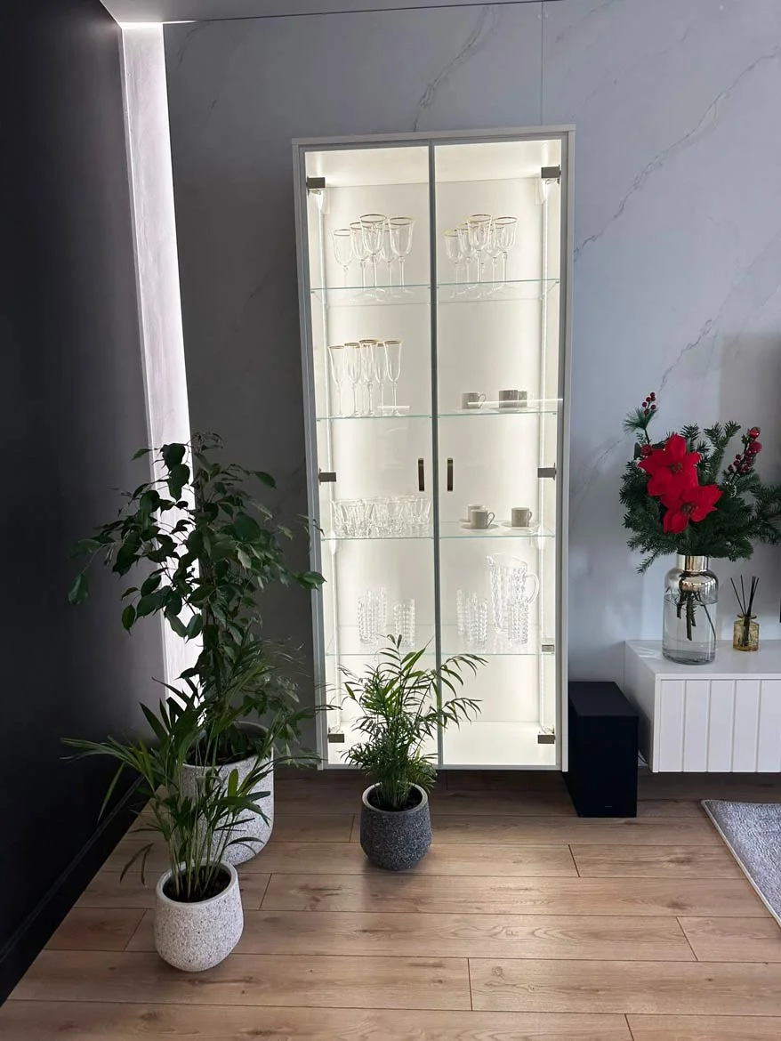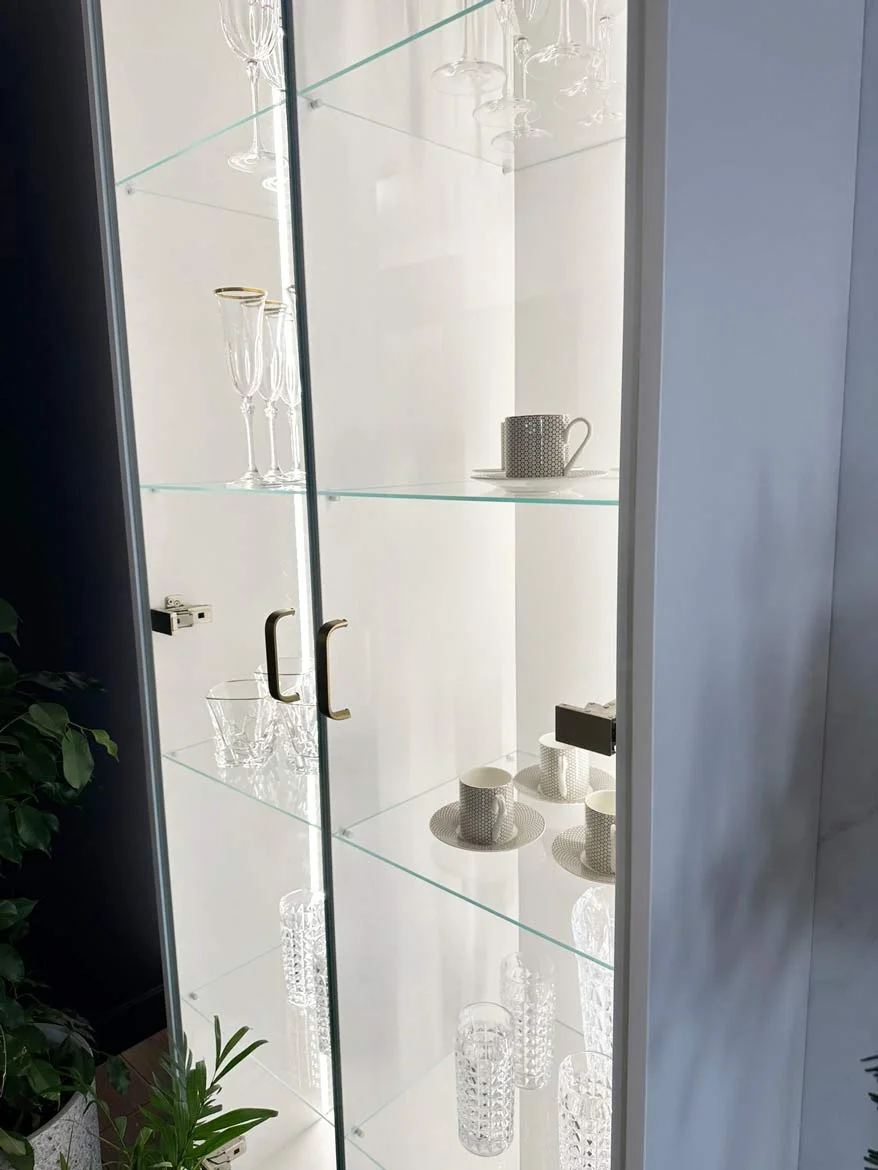 Die moderne beleuchtete Glasvitrine ist der ideale Ort, um Porzellan, Glas oder Ihre Lieblingsdekorationen auszustellen. Sie ist in Weiß gehalten und mit einer Verglasung versehen, die das Licht schön reflektiert und das Interieur optisch aufhellt.