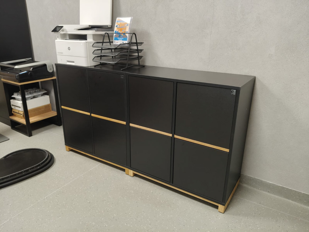 Für einen Kunden aus Górzyca haben wir Bürokommoden angefertigt, die Ordnung und eine ruhige, professionelle Atmosphäre in das Büro bringen. Die schlichte schwarze Form wurde mit einer horizontalen Naturholzeinlage und einem Holzsockel akzentuiert, wodurch das Ganze elegant und zeitlos wirkt.
