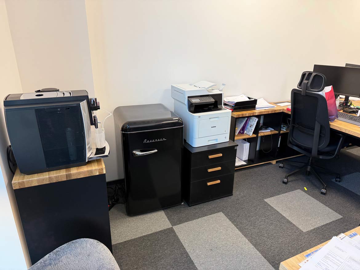 Schränke nehmen alle wichtigen Dokumente auf, während Regale und Podeste dafür sorgen, dass alles, was bei der Arbeit benötigt wird, immer griffbereit ist. Der Kaffeemaschinenschrank hat seinen Platz im Entspannungsbereich gefunden – damit der Kaffee immer in Reichweite ist.