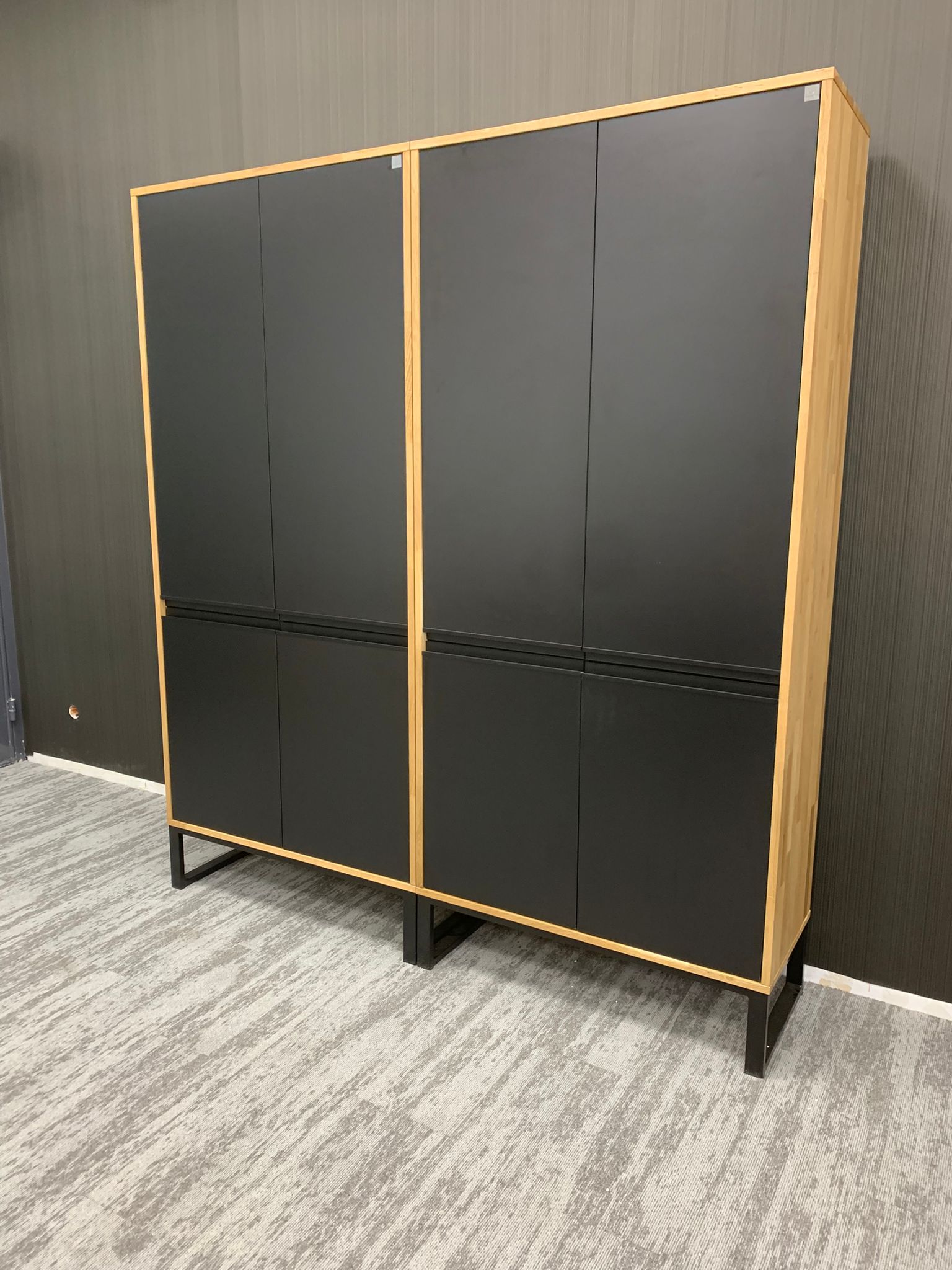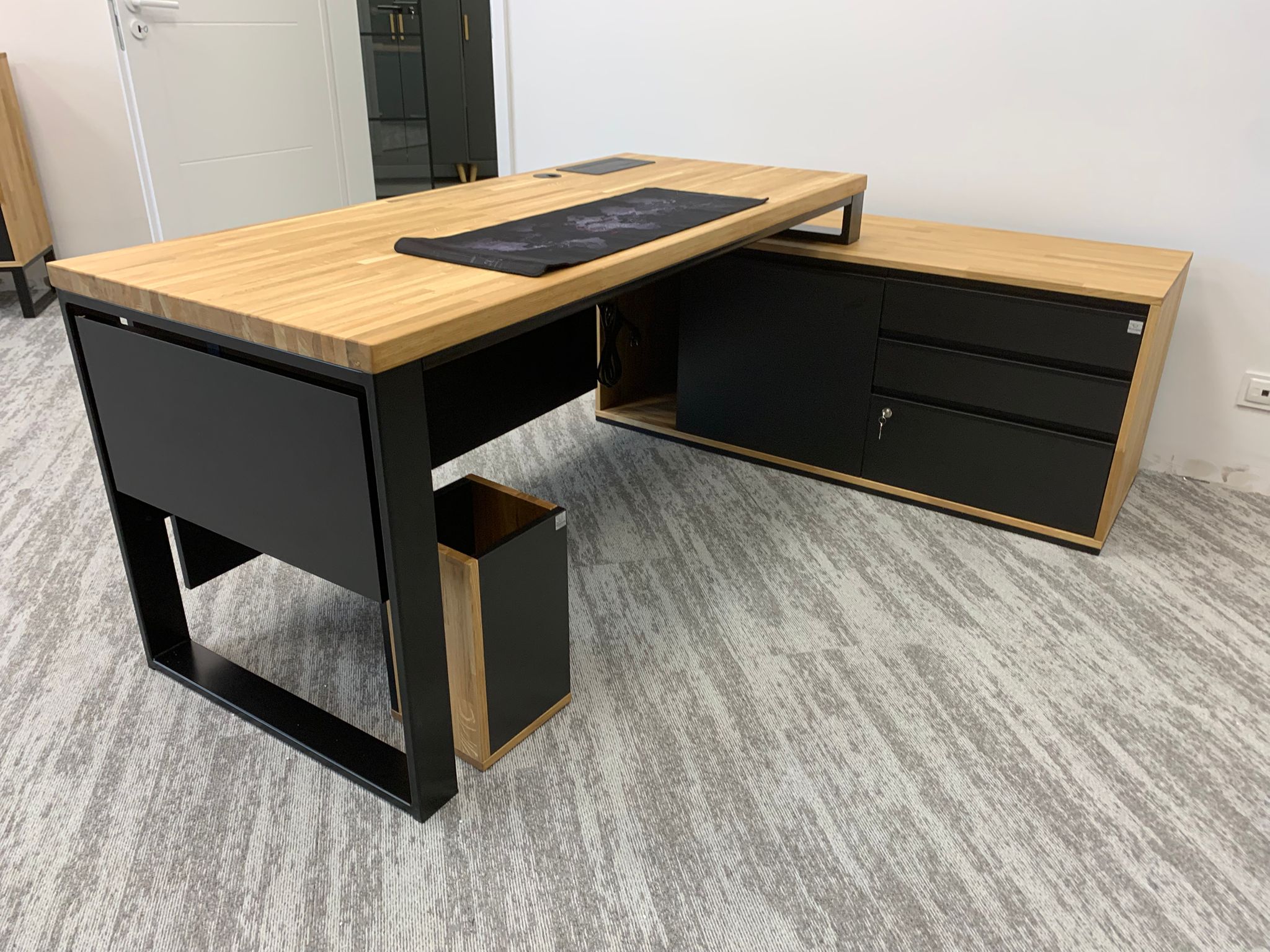 Das Design wird von natürlichen Holztönen und tiefem Schwarz dominiert, die der Einrichtung ein geschlossenes und professionelles Aussehen verleihen. Dieser Kontrast funktioniert gut in modernen Räumen und zieht die Aufmerksamkeit auf sich, ohne seine Eleganz zu verlieren.