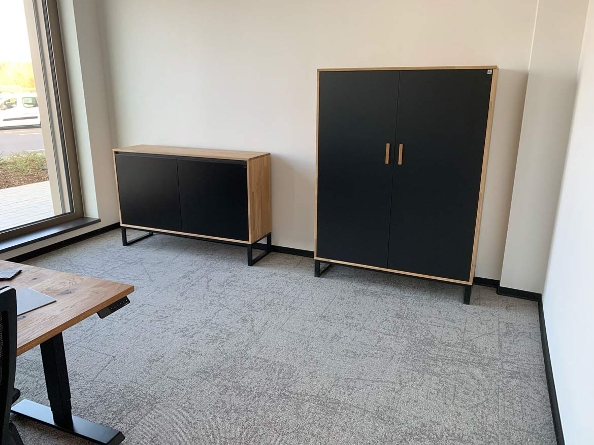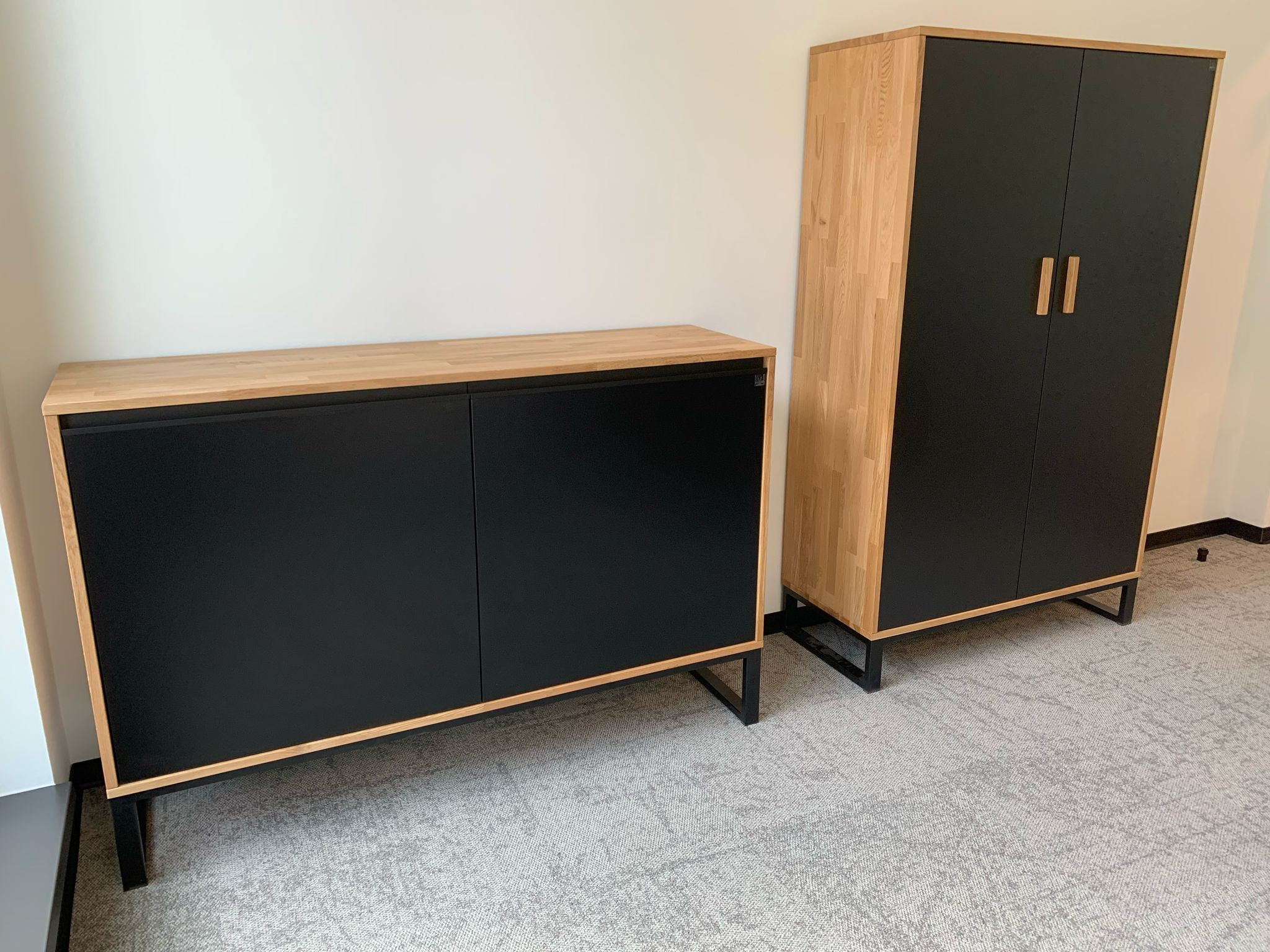 Für unseren Kunden aus Köln haben wir ein elegantes Büromöbelset bestehend aus einer Kommode und einem Aktenschrank. Die Möbel wurden aus einer Kombination aus schwarzen Fronten und natürlicher Eiche gefertigt, was ihnen einen zeitlosen Look und eine solide Verarbeitung verleiht.