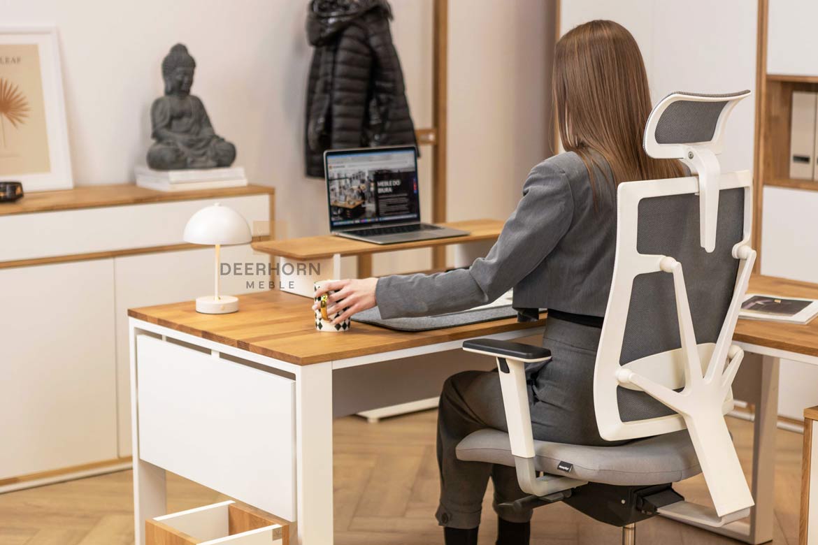 Es lohnt sich, warme Akzente im Büro zu setzen – Arbeitsplatten aus Holz, Pflanzen, sanfte Beleuchtung oder Bilder. Natürliche Materialien bringen Ruhe und machen das Büro einladend. Selbst ein kleines Detail, wie z.B. ein Kleiderständer aus Eichenholz, kann die Atmosphäre eines Raumes verändern.
