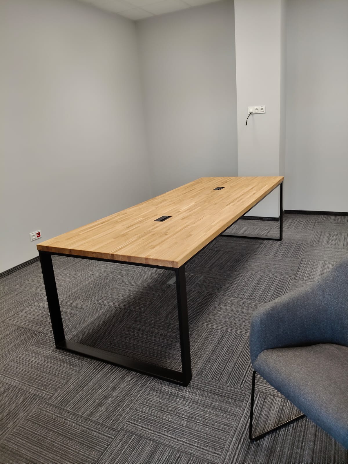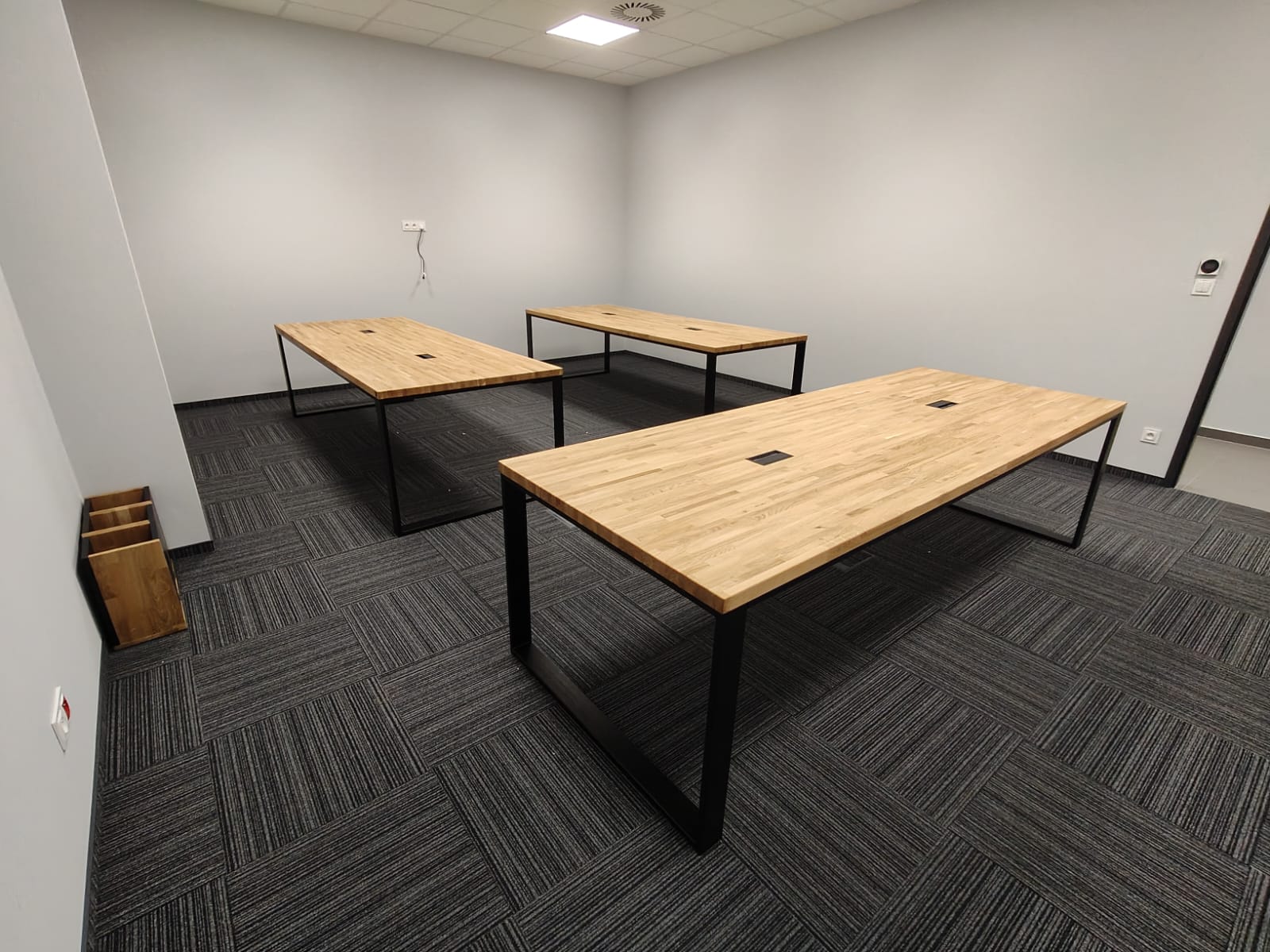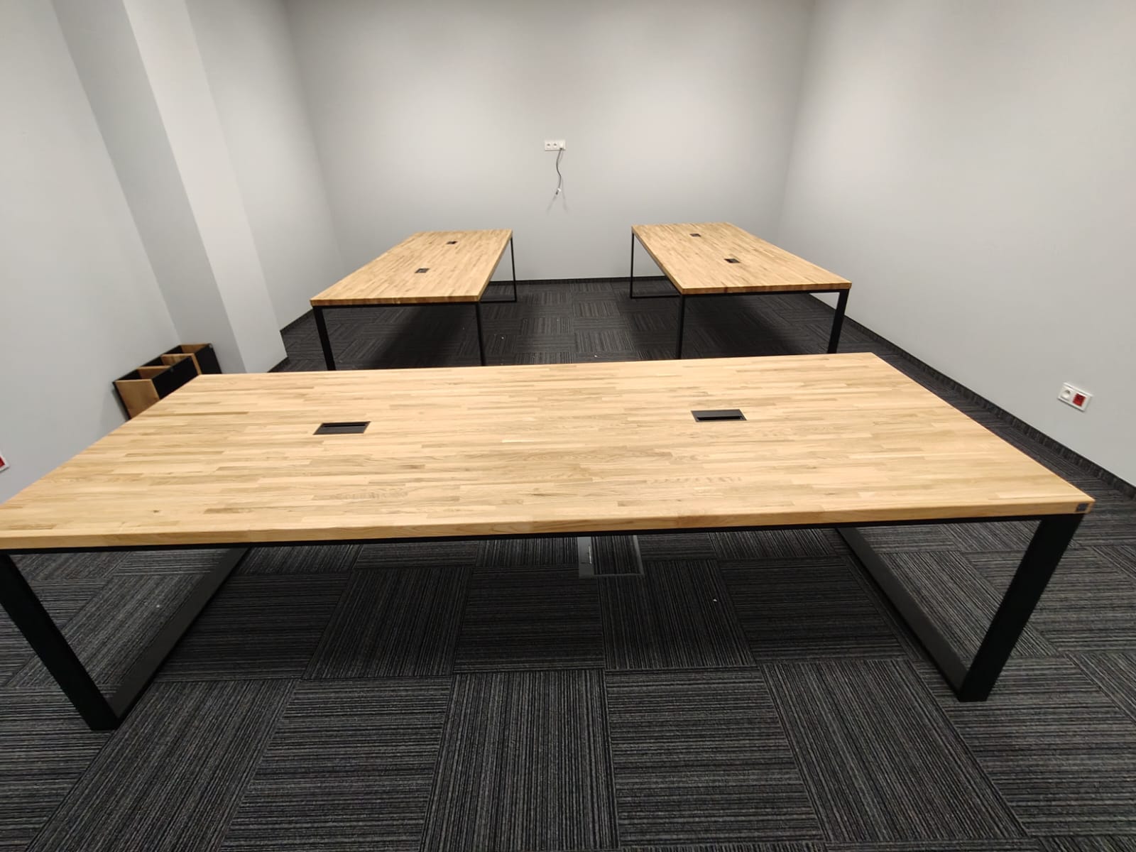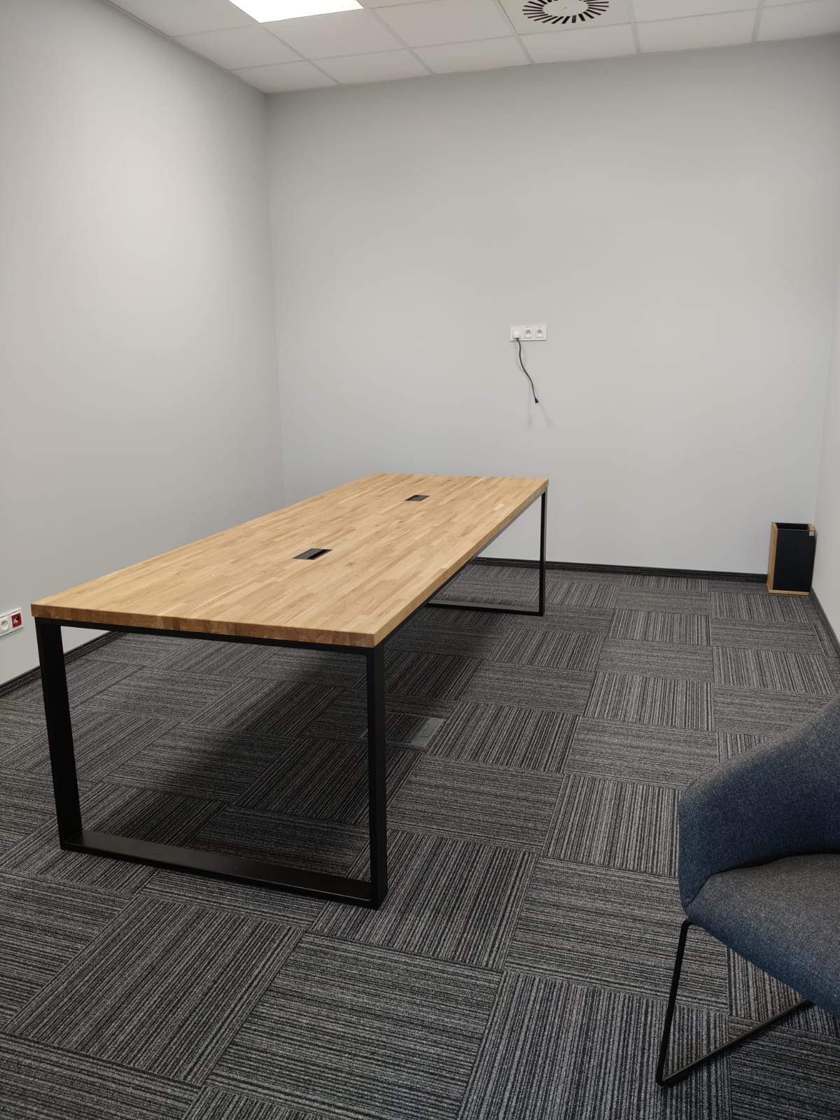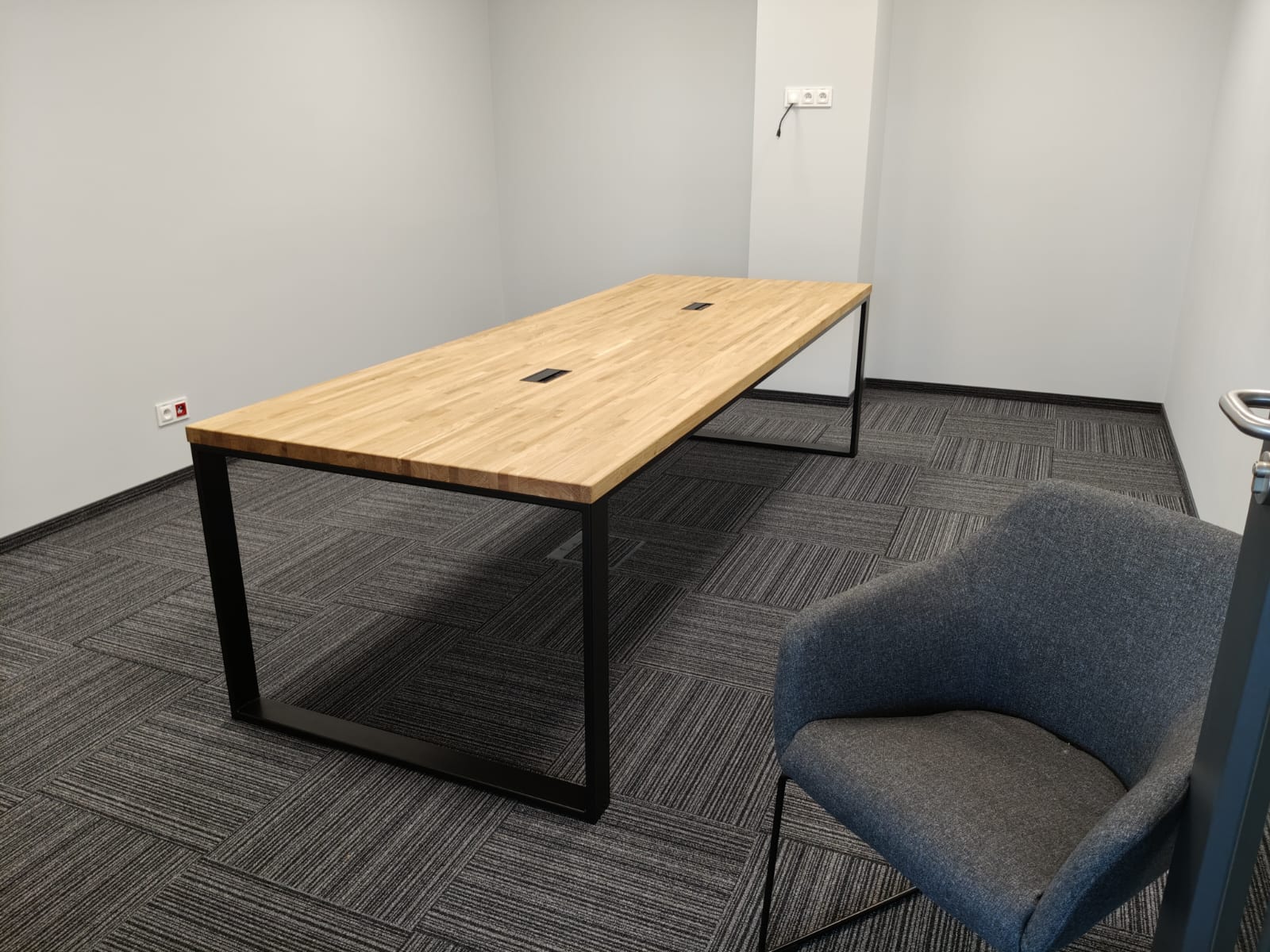 Bei dieser Realisierung haben wir die Einrichtung eines Konferenzraums für ein Produktionsunternehmen in der Nähe von Katowice vorbereitet. Wir haben drei große Tische mit Tischplatten aus massiver Eiche und Metallbeinen eingebaut. Dies ist eine einfache, solide und komfortable Lösung – ideal für tägliche Besprechungen, Präsentationen oder Teamarbeit. Die Tische sind mit Kabeldurchführungen versehen, so dass Sie bei der Verwendung von Laptops oder Multimedia-Geräten leicht Ordnung halten können.