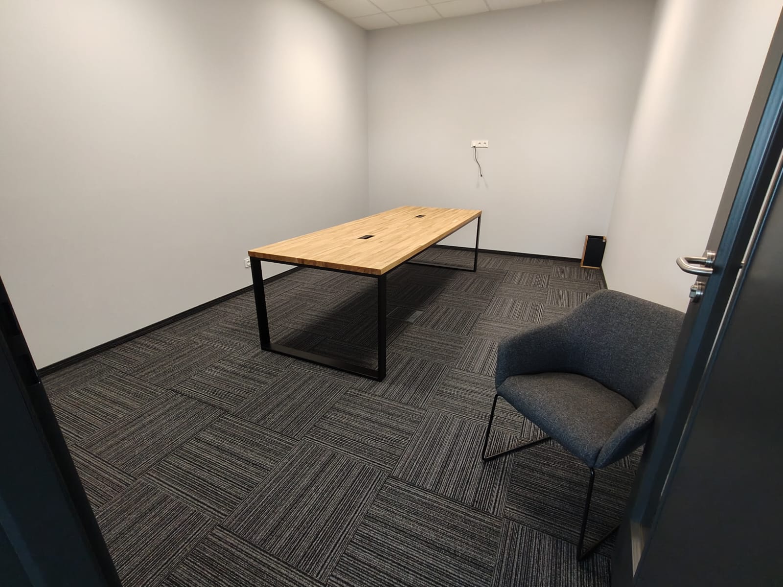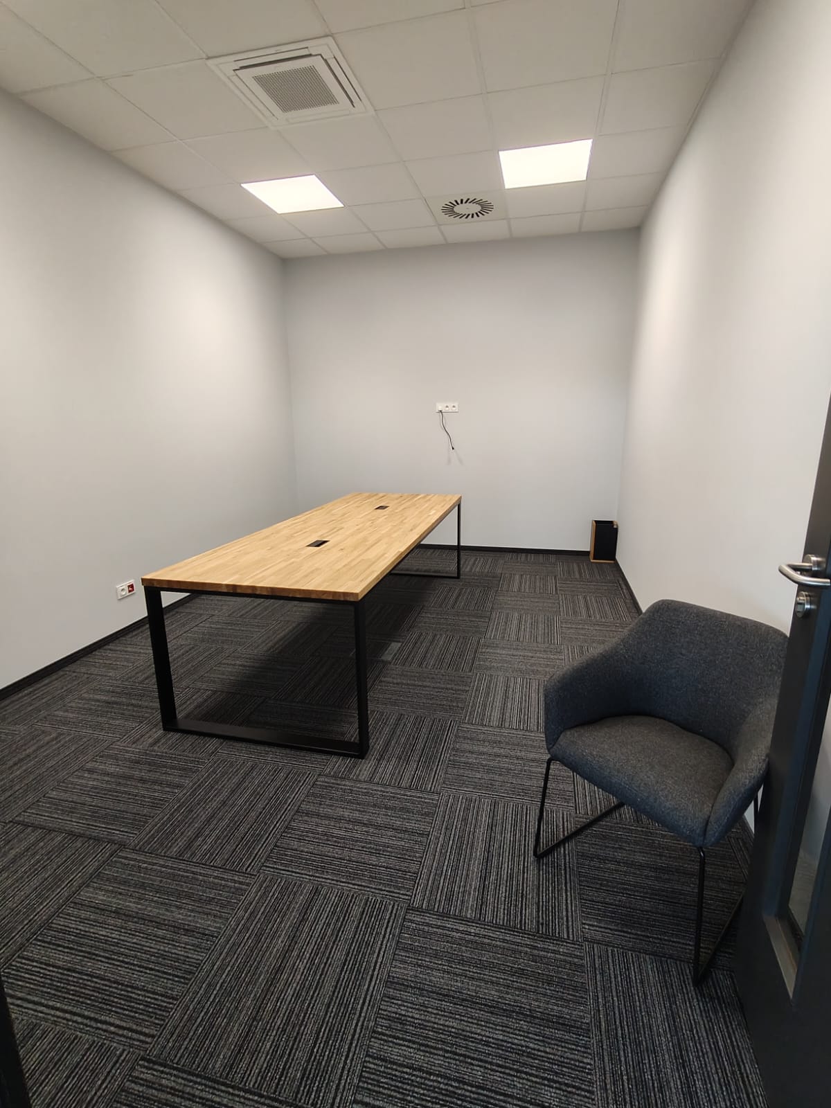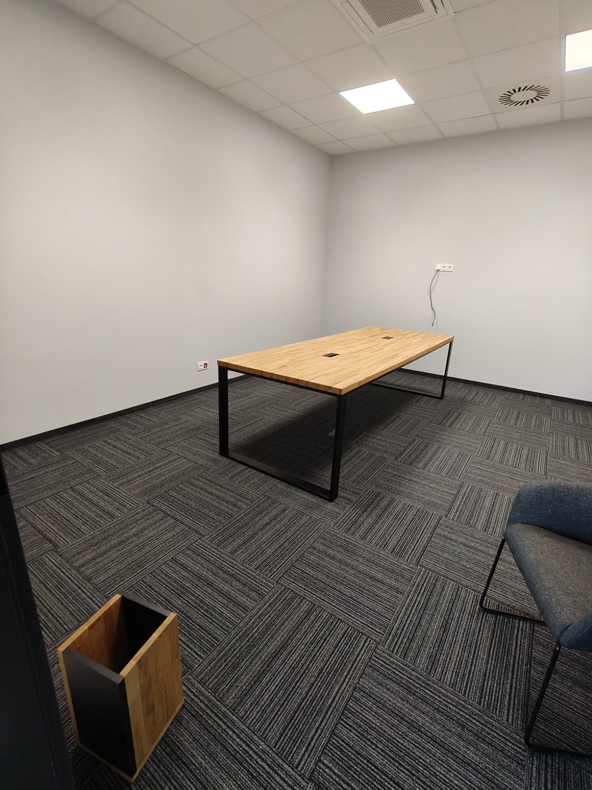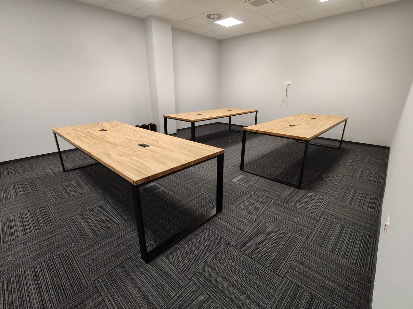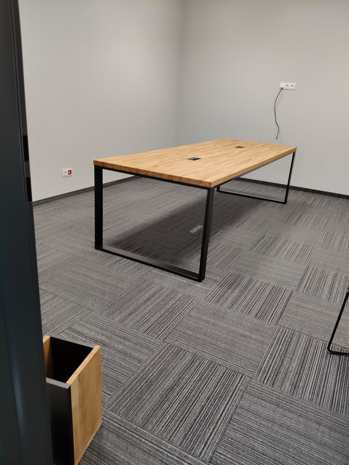 Bei dieser Realisierung haben wir die Einrichtung eines Konferenzraums für ein Produktionsunternehmen in der Nähe von Katowice vorbereitet. Wir haben drei große Tische mit Tischplatten aus massiver Eiche und Metallbeinen eingebaut. Dies ist eine einfache, solide und komfortable Lösung – ideal für tägliche Besprechungen, Präsentationen oder Teamarbeit. Die Tische sind mit Kabeldurchführungen versehen, so dass Sie bei der Verwendung von Laptops oder Multimedia-Geräten leicht Ordnung halten können.