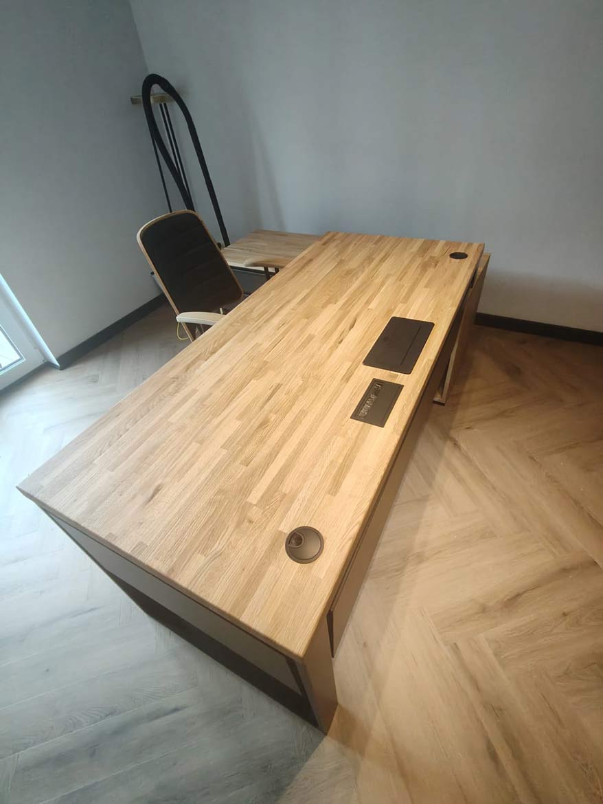 Für die Firma Voltex in Świdnica haben wir einen Eckschreibtisch mit einem großen Sockel und geräumigen Schubladen entworfen. Ergänzt wird das Set durch einen bequemen, ergonomischen Stuhl, die zusammen einen praktischen und komfortablen Platz für die tägliche Arbeit schaffen. Eine einfache Lösung, die im Büro gut funktioniert.
