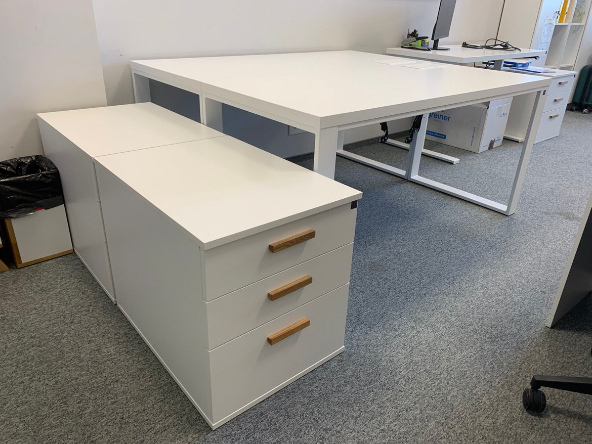 Für das Unternehmen Bioceltix S.A. aus Wrocław haben wir eine Reihe funktionaler Schreibtische aus weißer Möbelplatte gefertigt. Jeder Schreibtisch wurde durch einen praktischen Sockel mit Schubladen ergänzt, so dass die Arbeitsplätze bequem, aufgeräumt und für den täglichen Gebrauch bereit sind. Die helle Farbgebung hellt den Büroraum auf und verleiht ihm einen modernen, gepflegten Look.