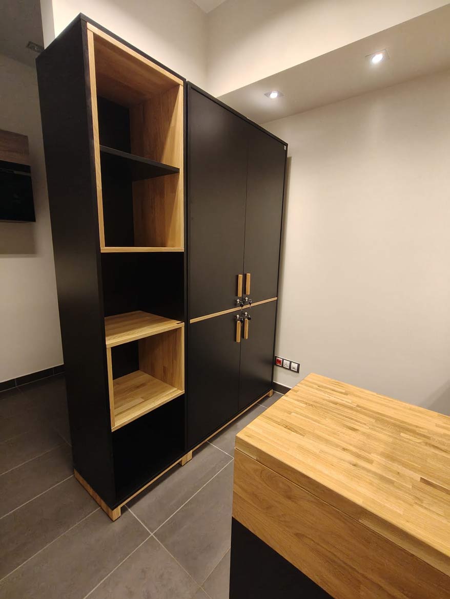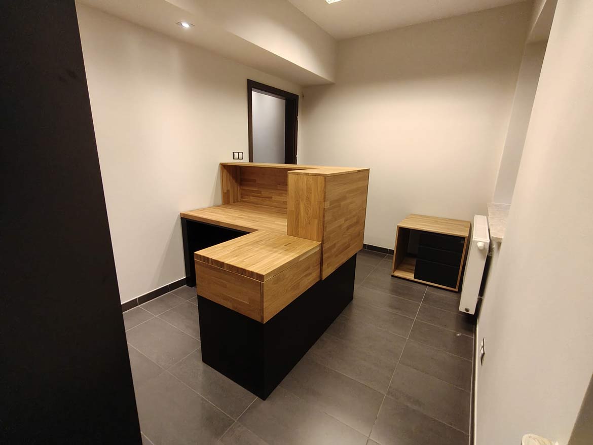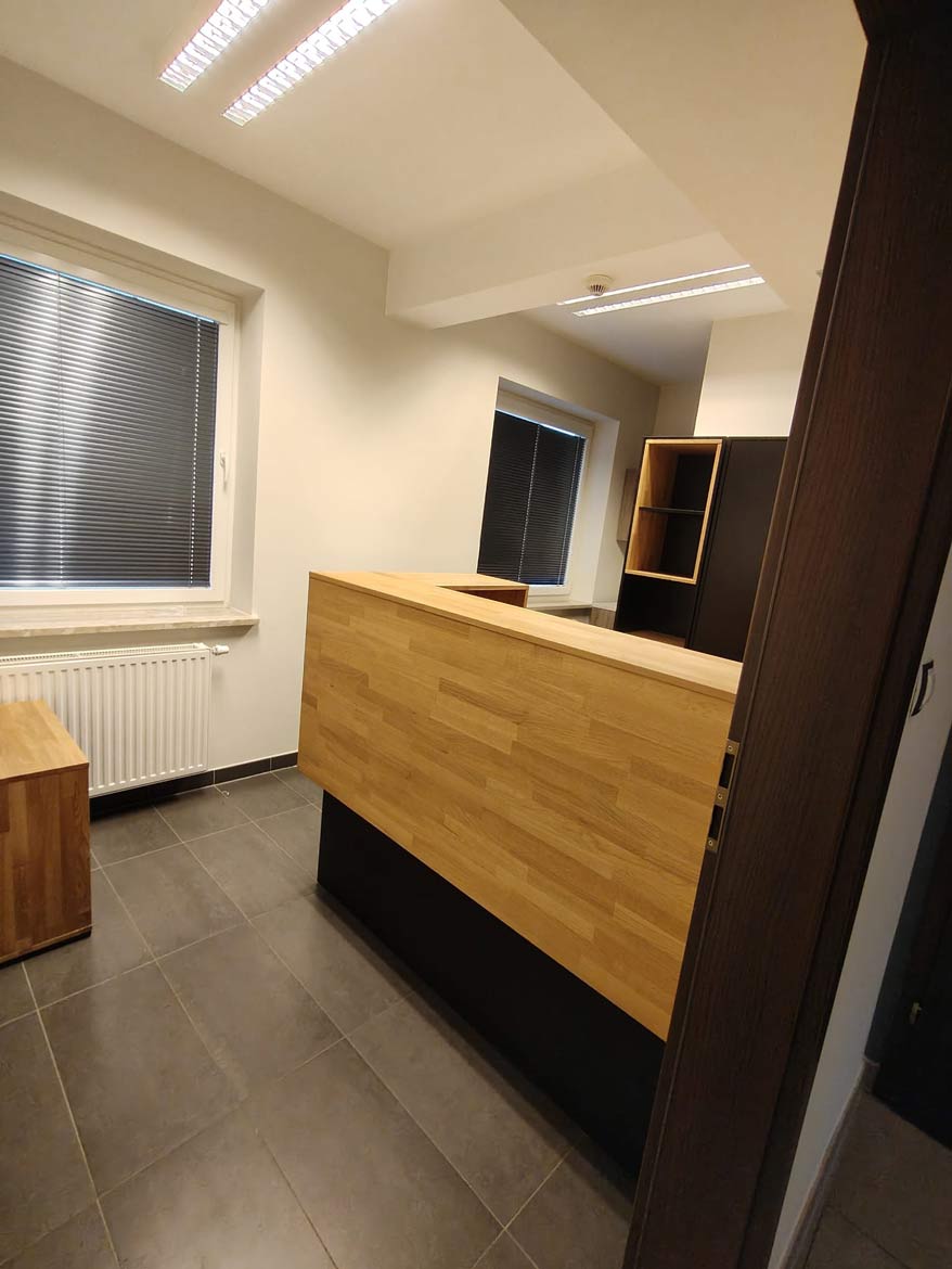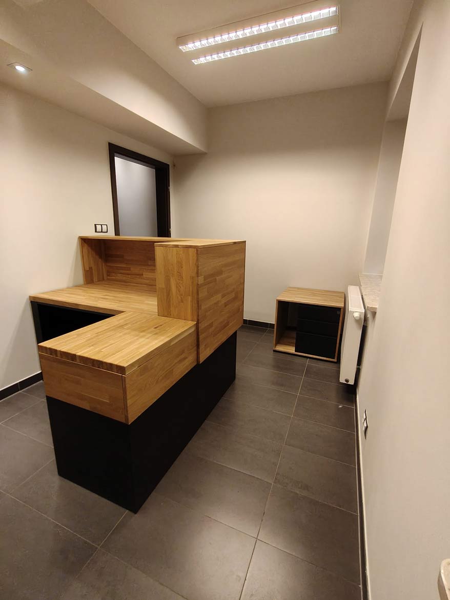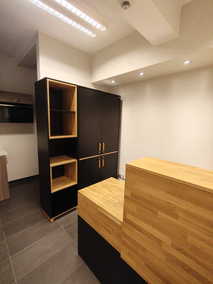 Die Realisierung umfasst einen hölzernen Empfangstresen, der die Kunden schon an der Schwelle begrüßt, einen abschließbaren Schrank zur Aufbewahrung von Dokumenten und ein schmales Bücherregal für praktische Gegenstände. Das Ganze schafft einen kohärenten und geordneten Raum, in dem die Arbeit einfach leichter wird.