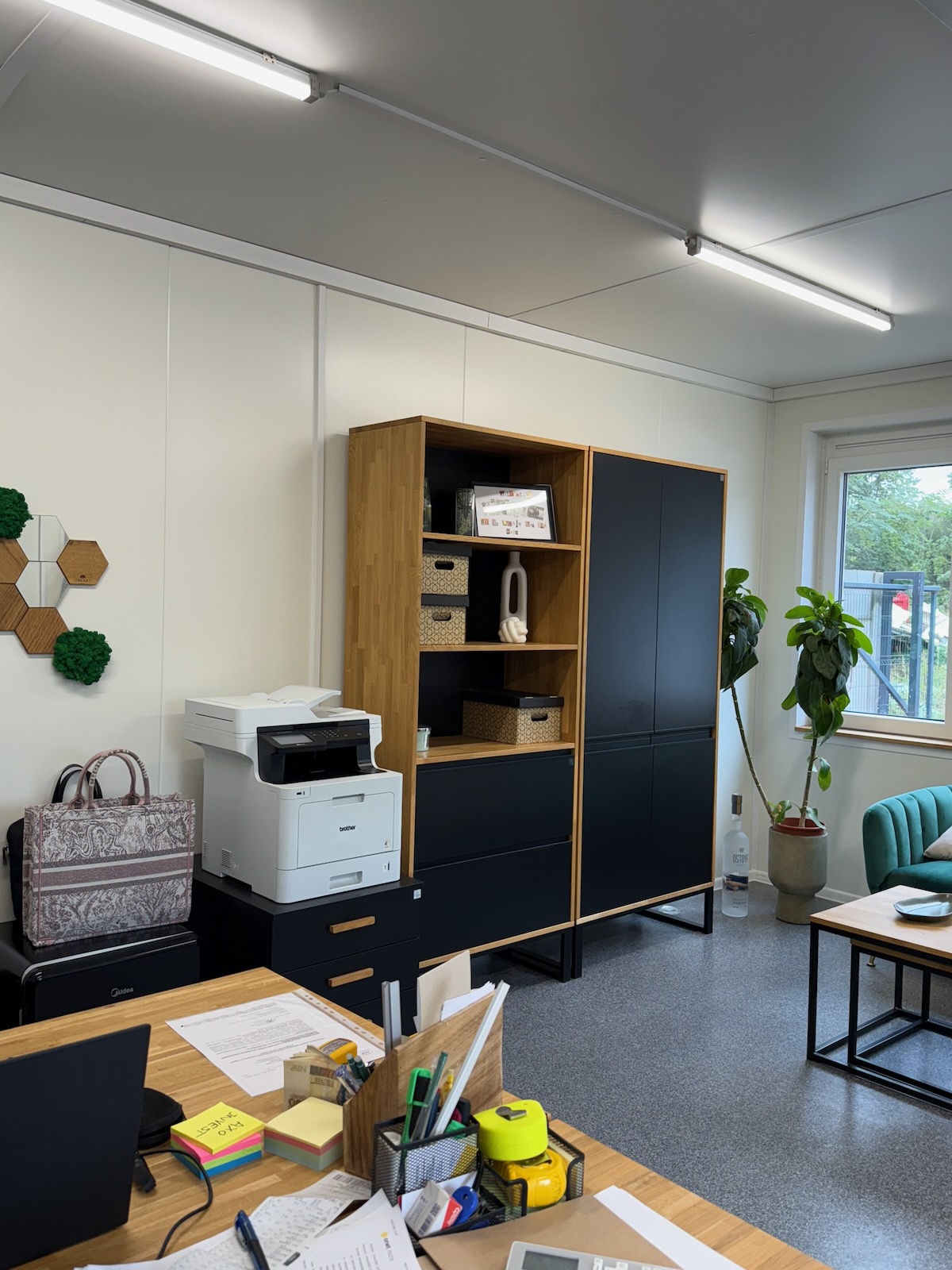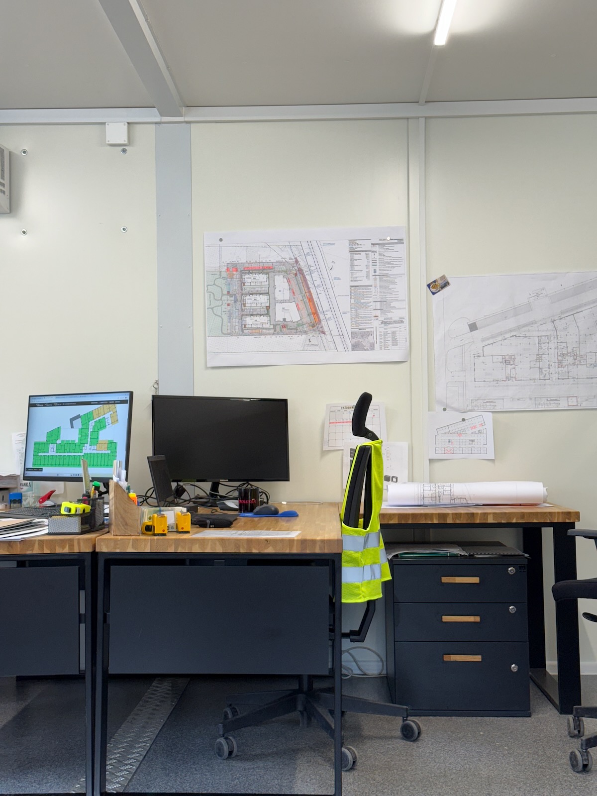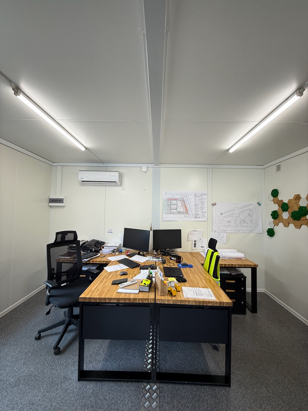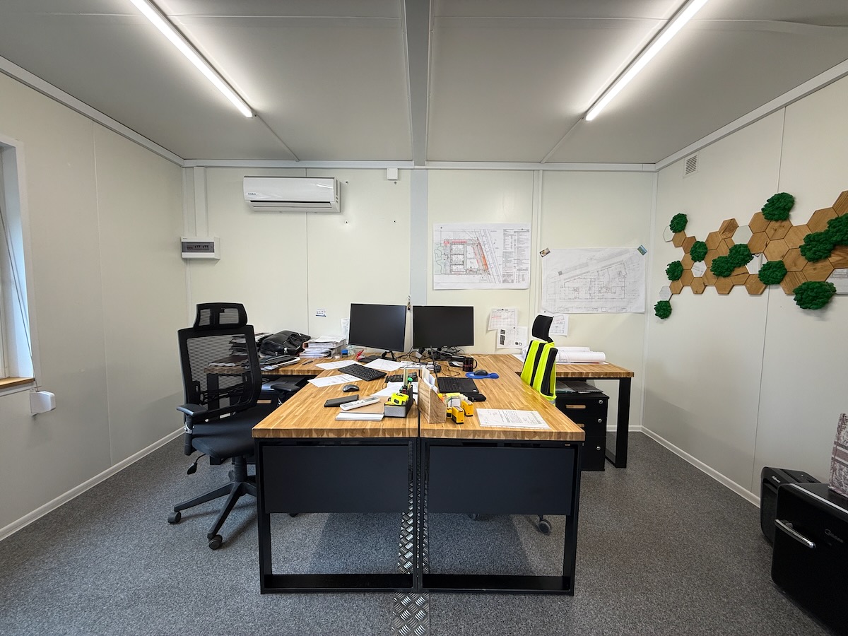 Hirschhorn-Möbel in einem Bürocontainer auf einer Baustelle