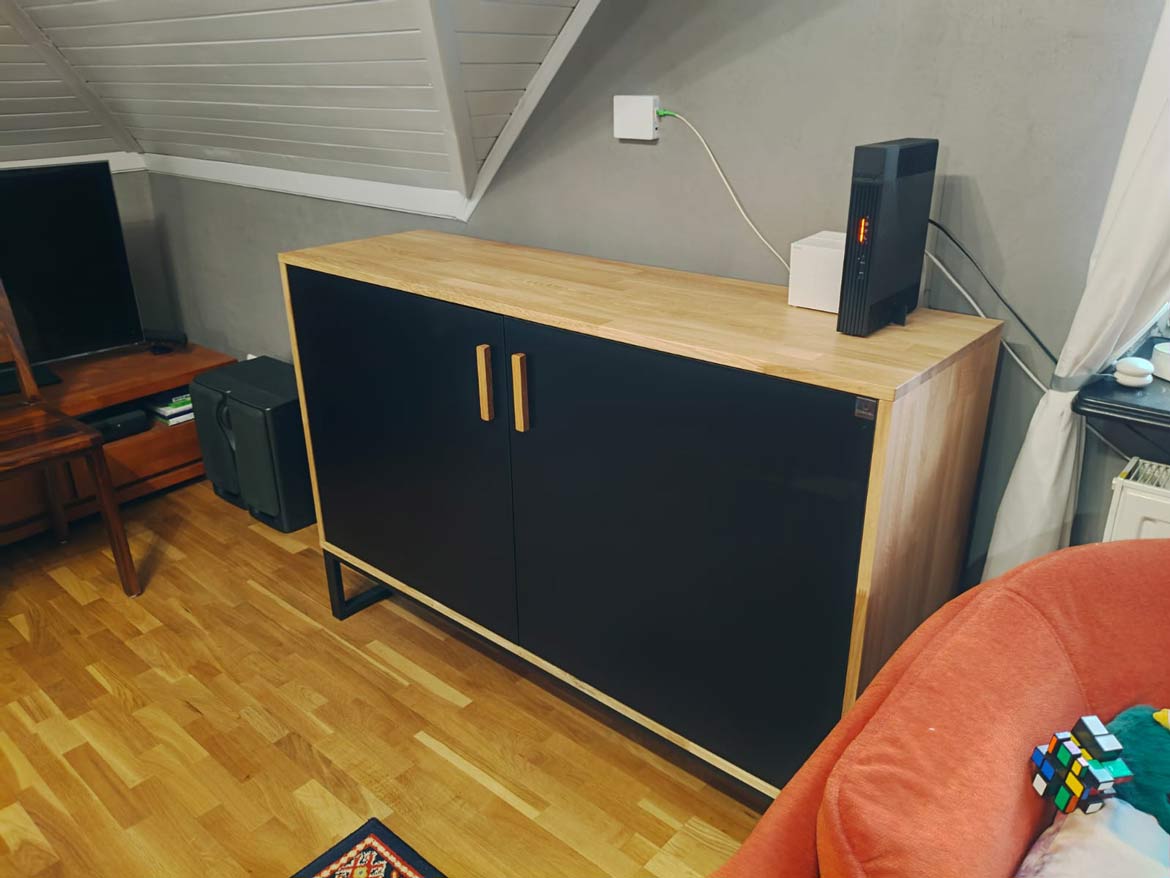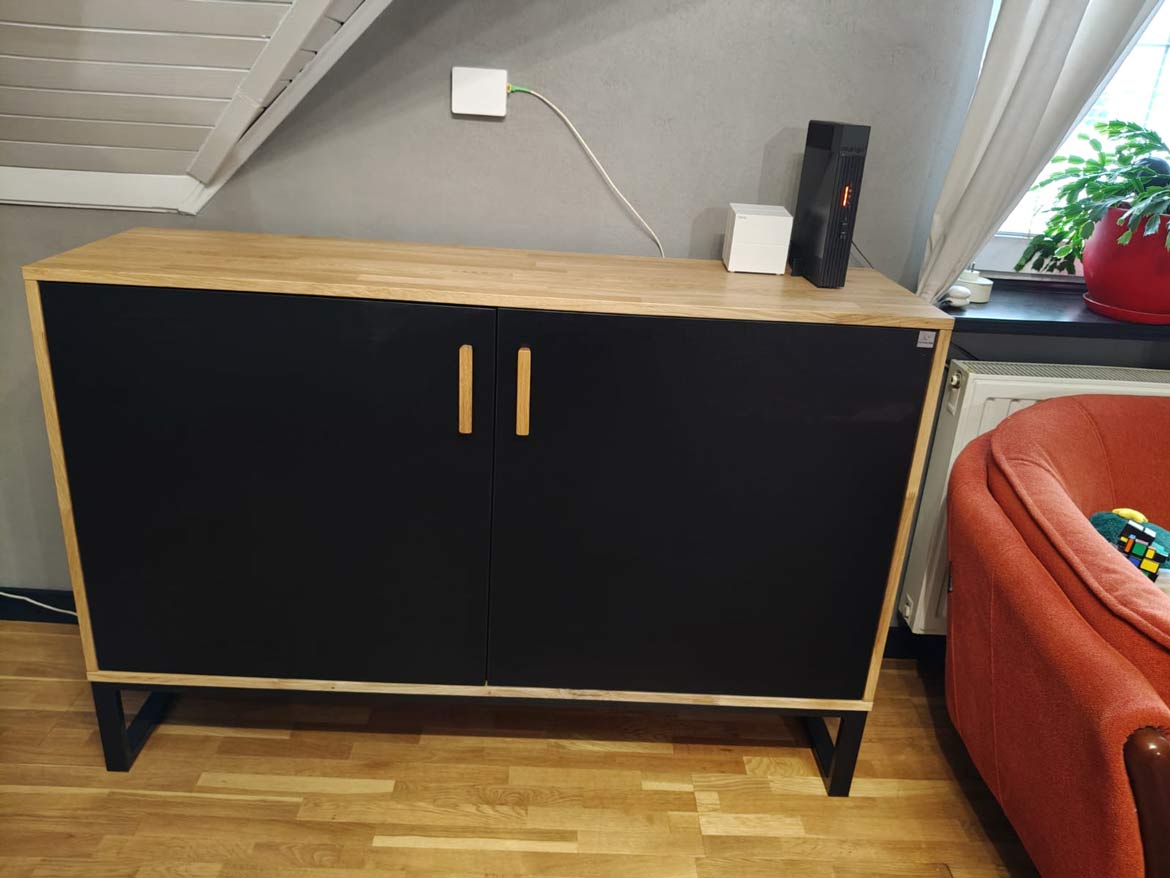 Wir haben eine elegante zweitürige Kommode in Schwarz und Holz für Frau Anita aus Krakau angefertigt. Das Möbelstück passt perfekt zur Einrichtung der Wohnung – es wirkt modern, aber gleichzeitig sehr gemütlich. Dank ihres geräumigen Innenraums kann sie problemlos alle Haushaltsgegenstände unterbringen, und die Oberseite kann als Ablage für Dekorationen oder RTV-Geräte genutzt werden.
