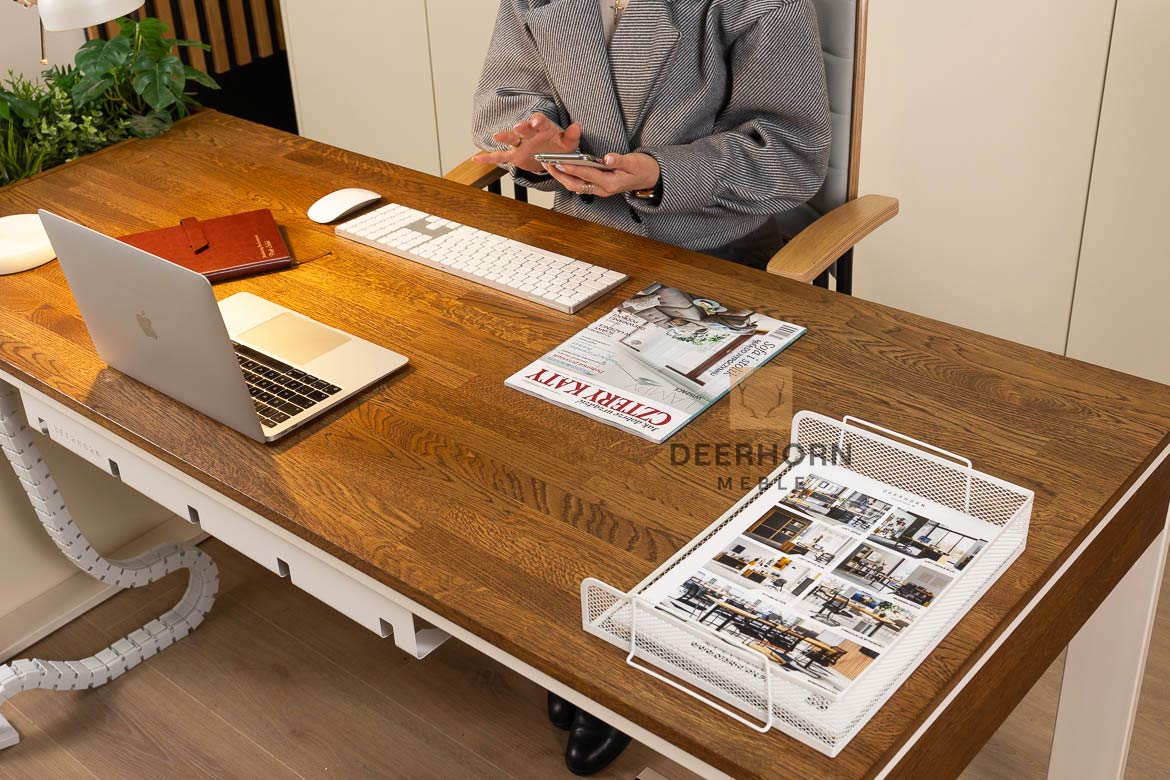 Eine großartige Lösung ist ein Schreibtisch mit einer Eichenplatte. Dieses Material ist langlebig, solide und angenehm im täglichen Gebrauch. Natürliches Holz erwärmt das Interieur, bringt Ruhe und macht den Arbeitsplatz einladender. Die Eichenholzplatte hält auch intensiver Arbeit stand und wird mit der Zeit noch edler, anstatt ihr Aussehen zu verlieren.