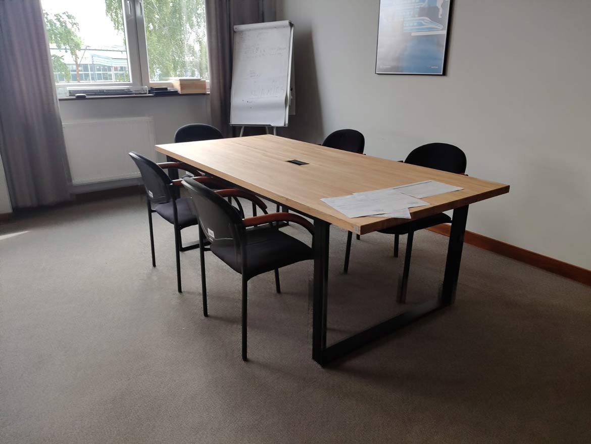 Wir haben einen einfachen, aber sehr eleganten Konferenztisch für WARS S.A. aus Warschau entworfen. Er hat eine Platte aus Massivholz und schwarze Metallbeine, die sein modernes Aussehen unterstreichen.