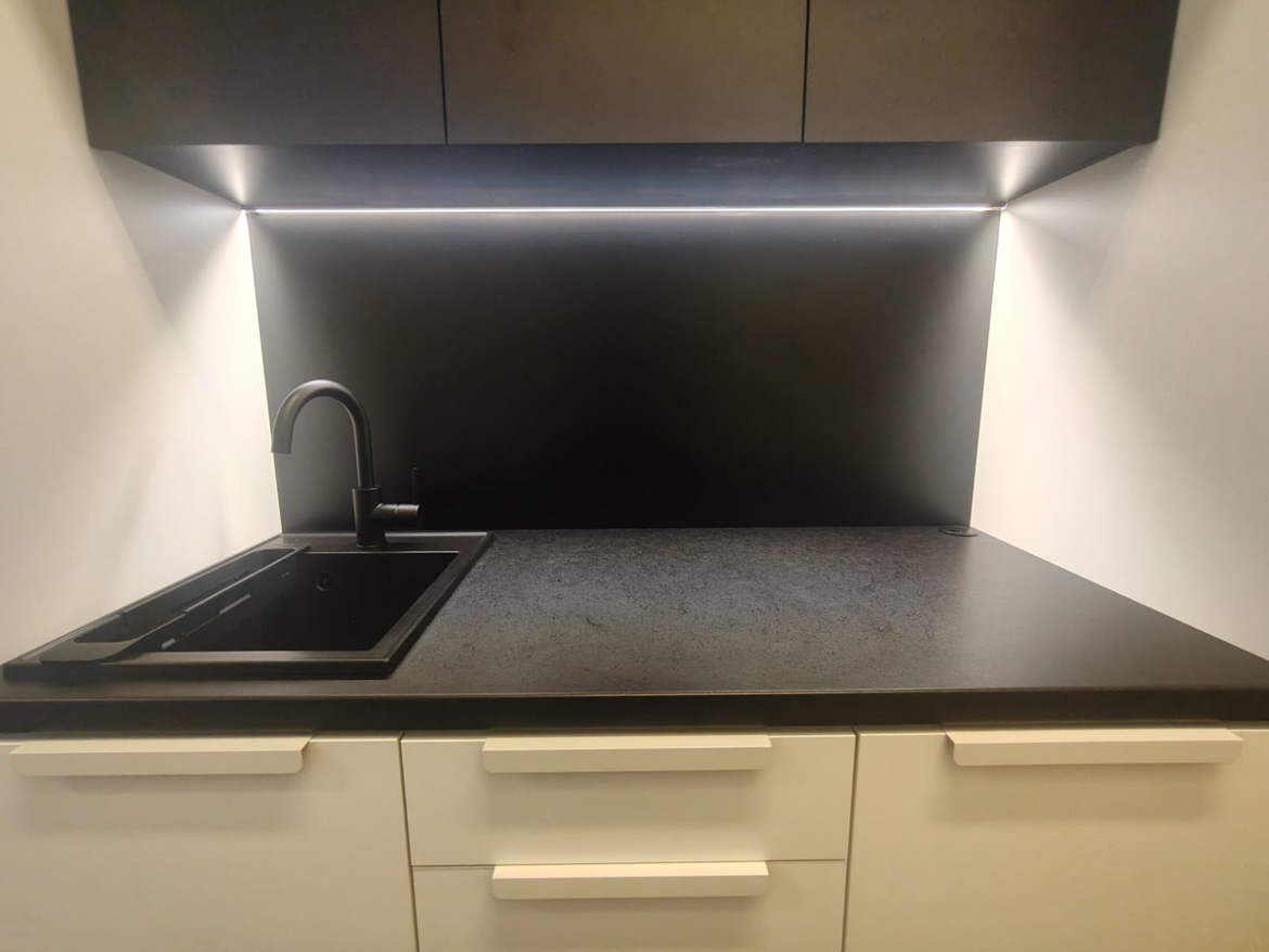 Der Anbau besteht aus unteren Schränken mit Stauraum, einer Arbeitsplatte mit Spüle und einem Oberschrank. Das Ganze ist in hellen Farben gehalten mit einer kontrastierenden dunklen Arbeitsplatte und Fronten im oberen Teil. Eine zusätzliche Beleuchtung unter den Schränken verbessert den Komfort des Arbeitsbereichs.