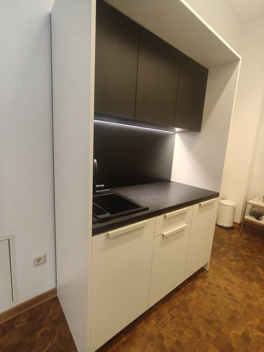 Für ein Architektur- und Ingenieurbüro in Frankfurt haben wir eine Küchenzeile für den täglichen Gebrauch des Teams entworfen. Die Schränke wurden so konzipiert, dass der verfügbare Platz gut genutzt wird und die Zubereitung von Kaffee oder eine kurze Arbeitspause bequem möglich ist.