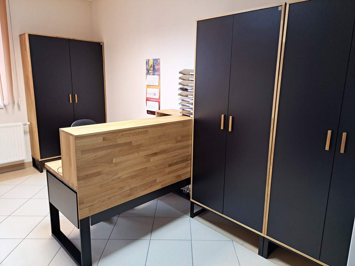 Die Einrichtung wird durch Aktenschränke im gleichen Stil ergänzt – die Kombination aus Naturholz und mattem Schwarz verleiht der Einrichtung Eleganz und Kohärenz. Dies verleiht dem Empfangsbereich nicht nur ein professionelles Aussehen, sondern auch einen funktionalen Ort für die Ablage und die tägliche Arbeitsorganisation.