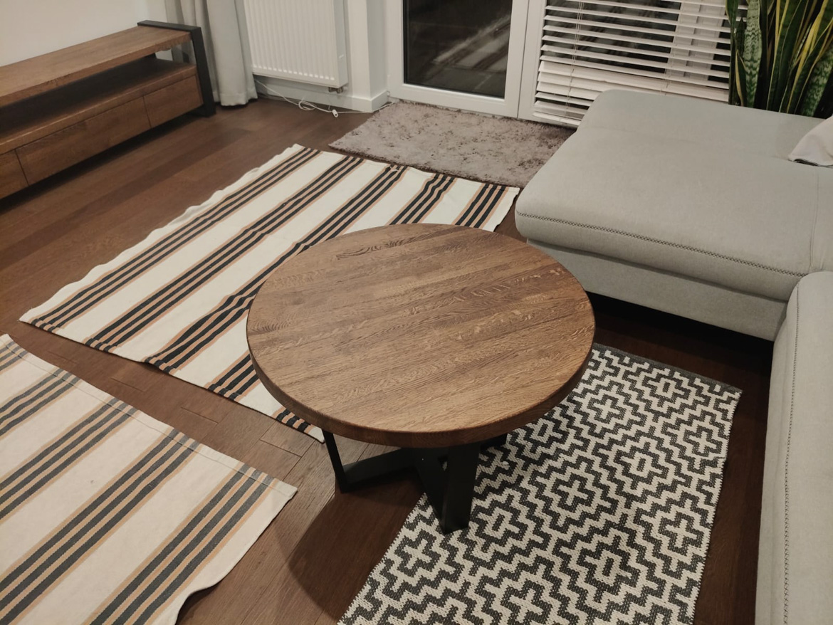 Runder Couchtisch mit dunkler Holzplatte für das Wohnzimmer eines Kunden aus Lublin