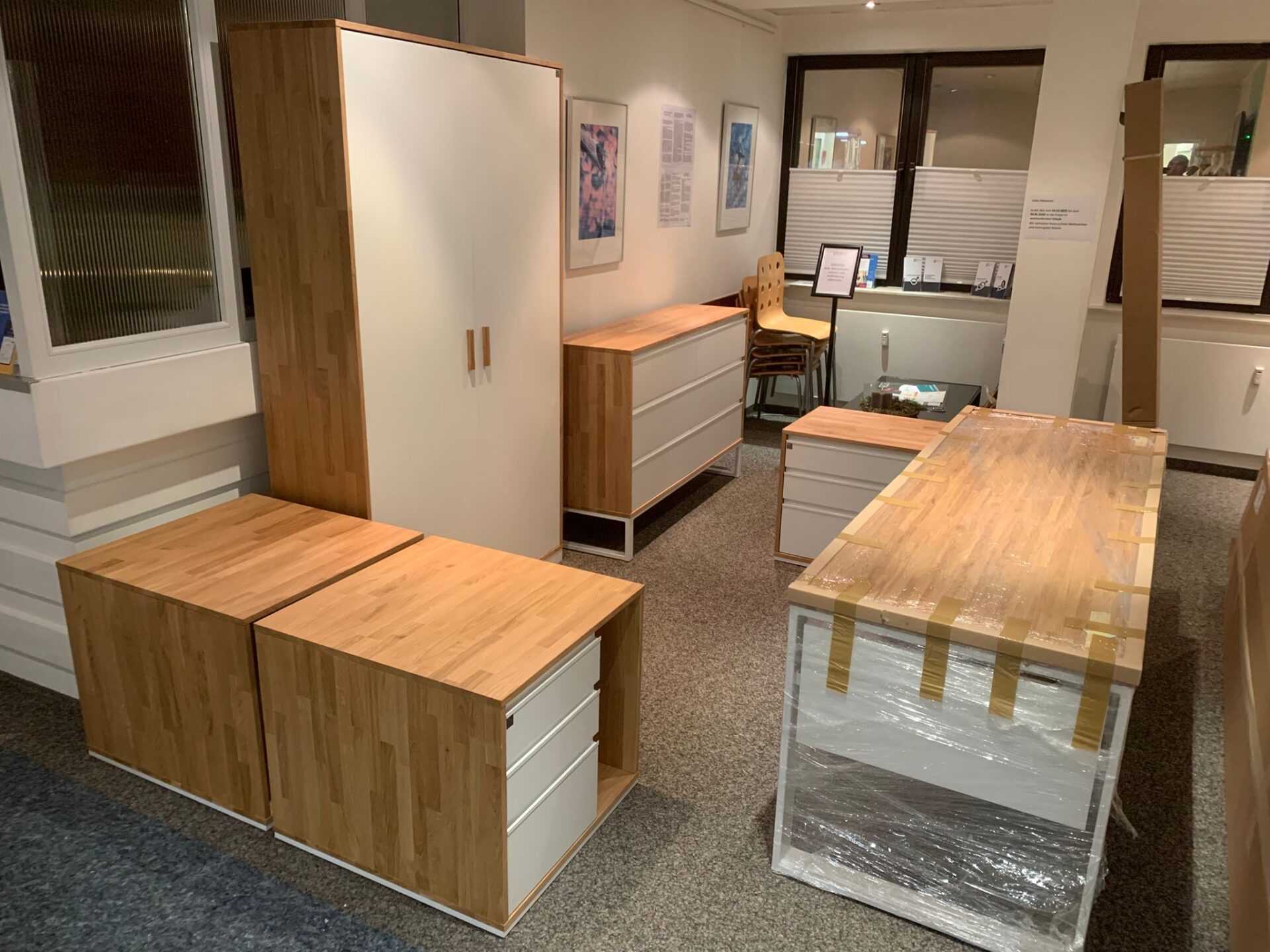Alle Möbel werden auf Paletten zusammengebaut geliefert, mit Ausnahme von Eckschreibtischen und großen Konferenztischen, die vor Ort ein wenig montiert werden müssen.
