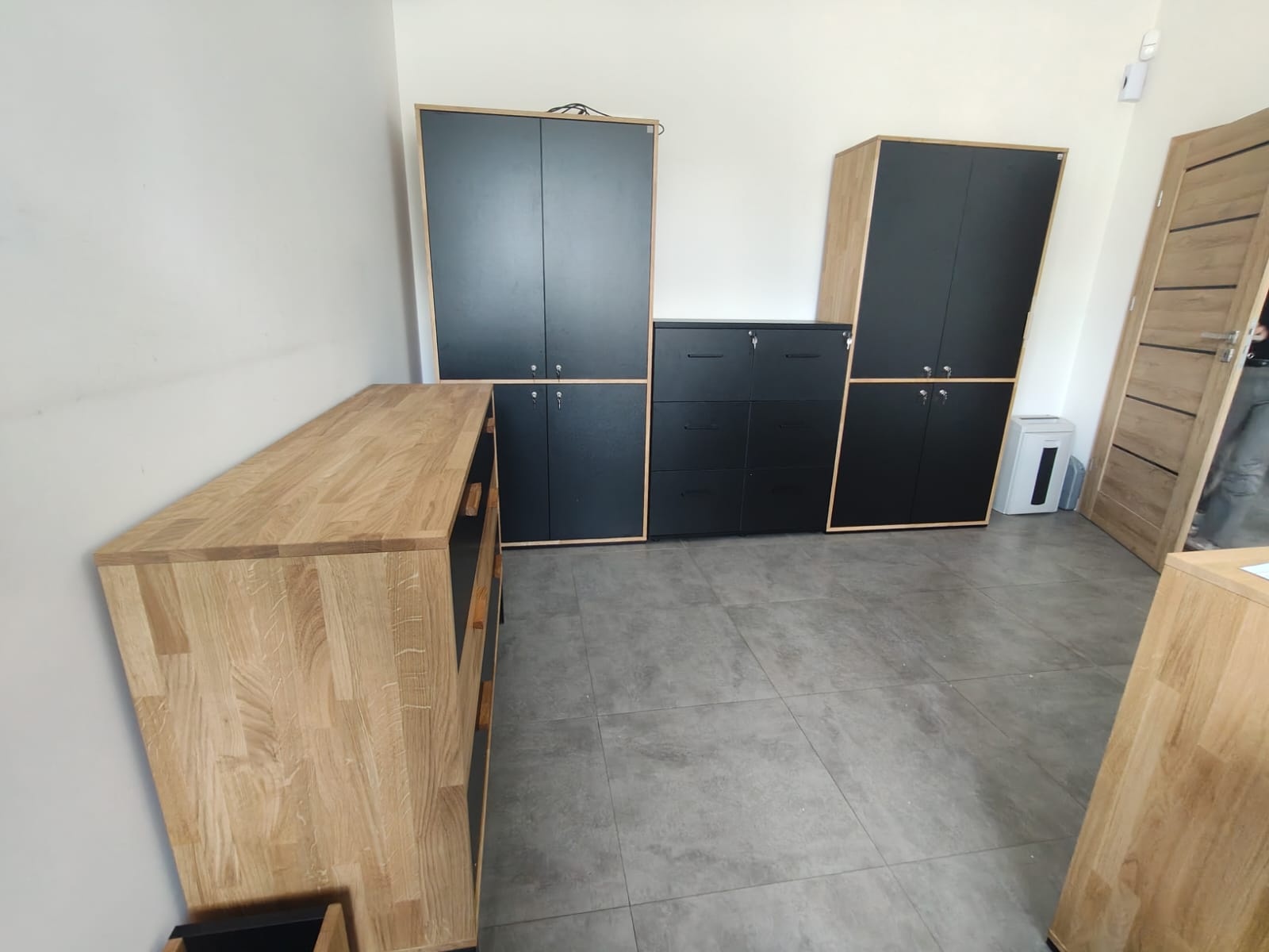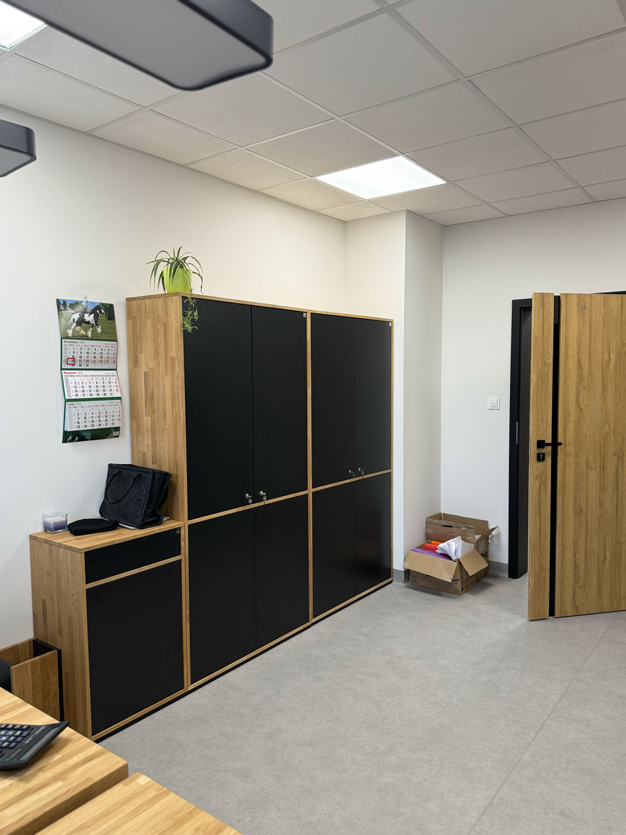 Das Regal und der Schrank bilden ein sehr harmonisches und elegantes Set. Sie sehen solide aus, sind geräumig und sorgen für Ordnung im Büro. Die Kombination aus Schwarz und Holz verleiht dem Ganzen einen professionellen, modernen Charakter. Eine sehr gelungene Lösung.