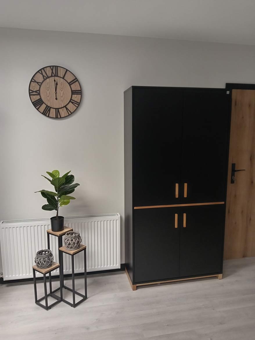 Schwarzer Kleiderschrank mit Holzgriffen