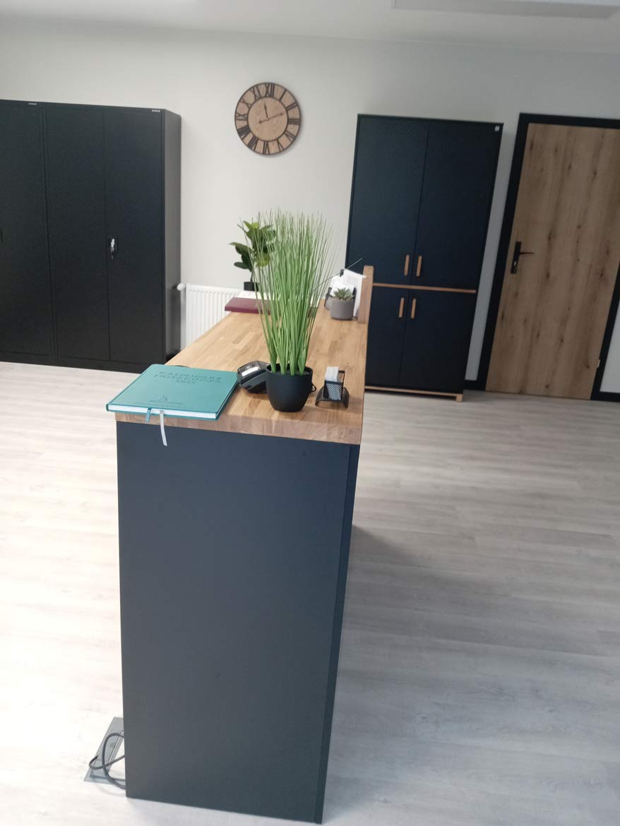 3. Ich füge noch einmal Bilder von den Möbeln an, die bereits vollständig aufgebaut und in Gebrauch sind. Sie sehen bombenmäßig aus, sie sind so stabil, dass man sie nicht mehr abnehmen kann. Und übrigens, bei einem eventuellen Fleck kann man die Restauration selbst machen und die Platte ist wie neu. Sie sind, massiv und gleichzeitig nicht übermächtig, das Interieur und durch die warme Farbe der Eiche die Atmosphäre der Mitarbeiter verbessert hat.