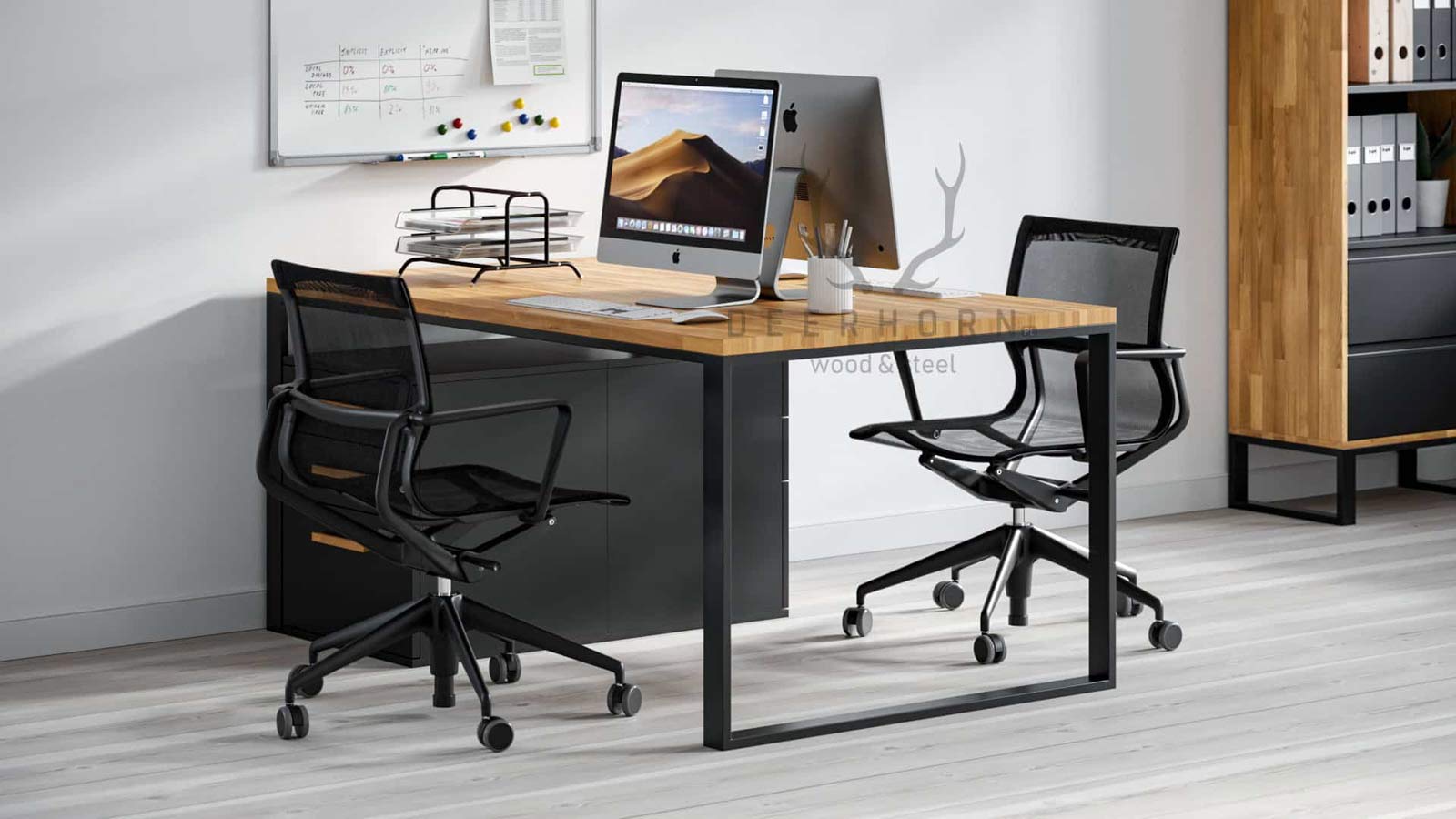 Der Doppelschreibtisch ist die perfekte Lösung für jedes moderne und funktionale Büro. Ein praktisches Möbelstück von Deerhorn, das durch die Investition in ein Möbelstück ergonomische Arbeitsplätze für zwei Mitarbeiter bietet.