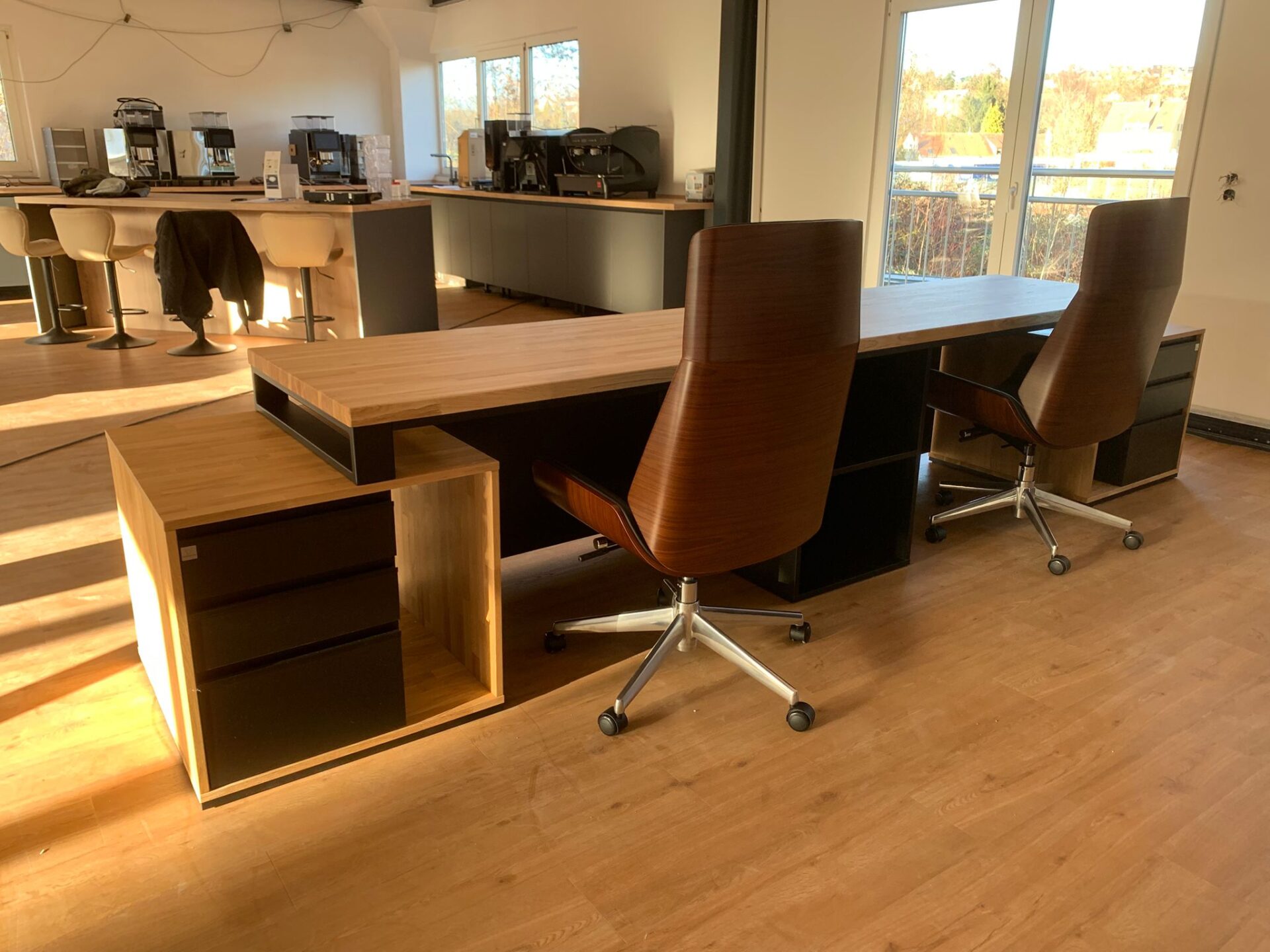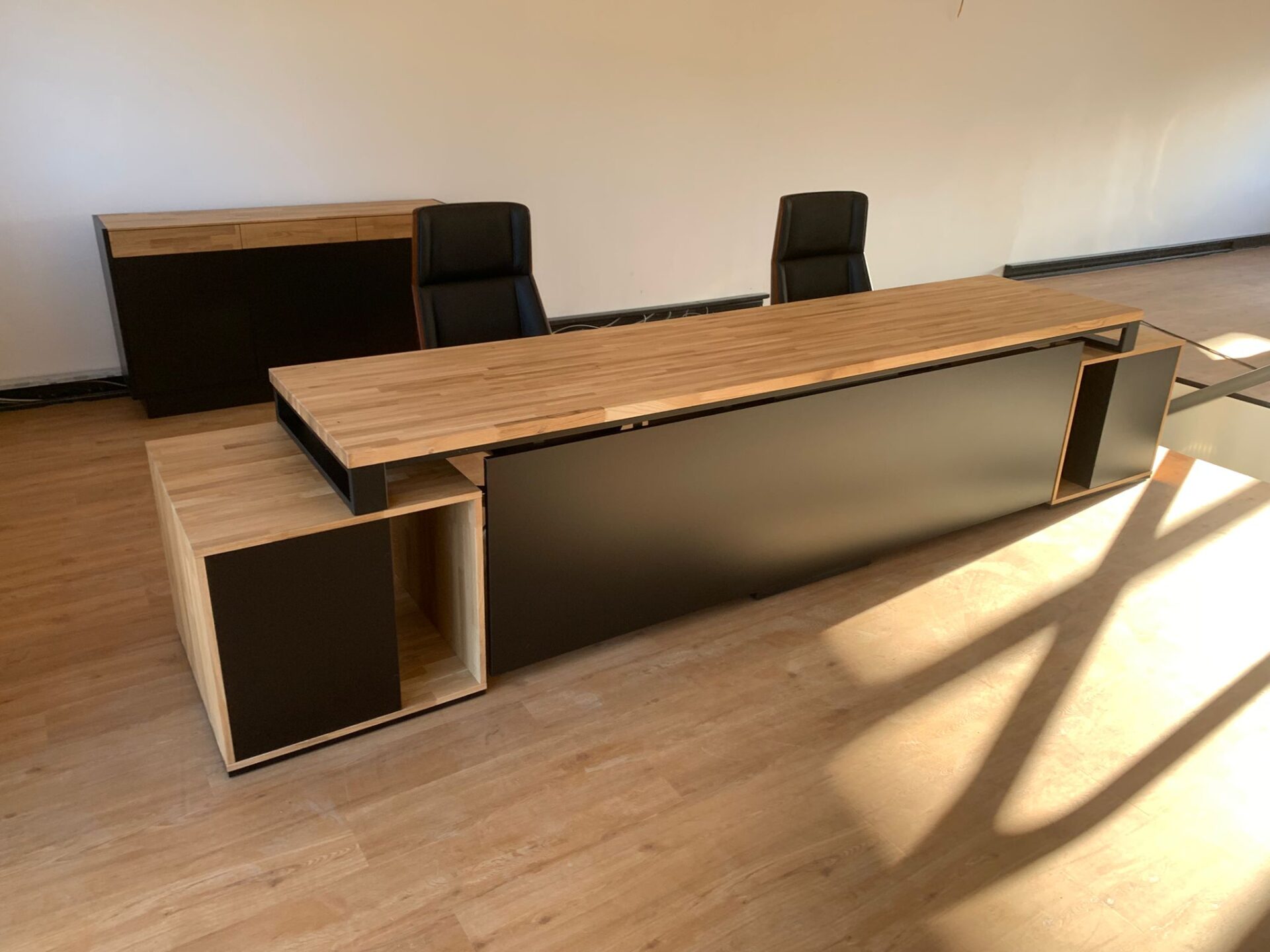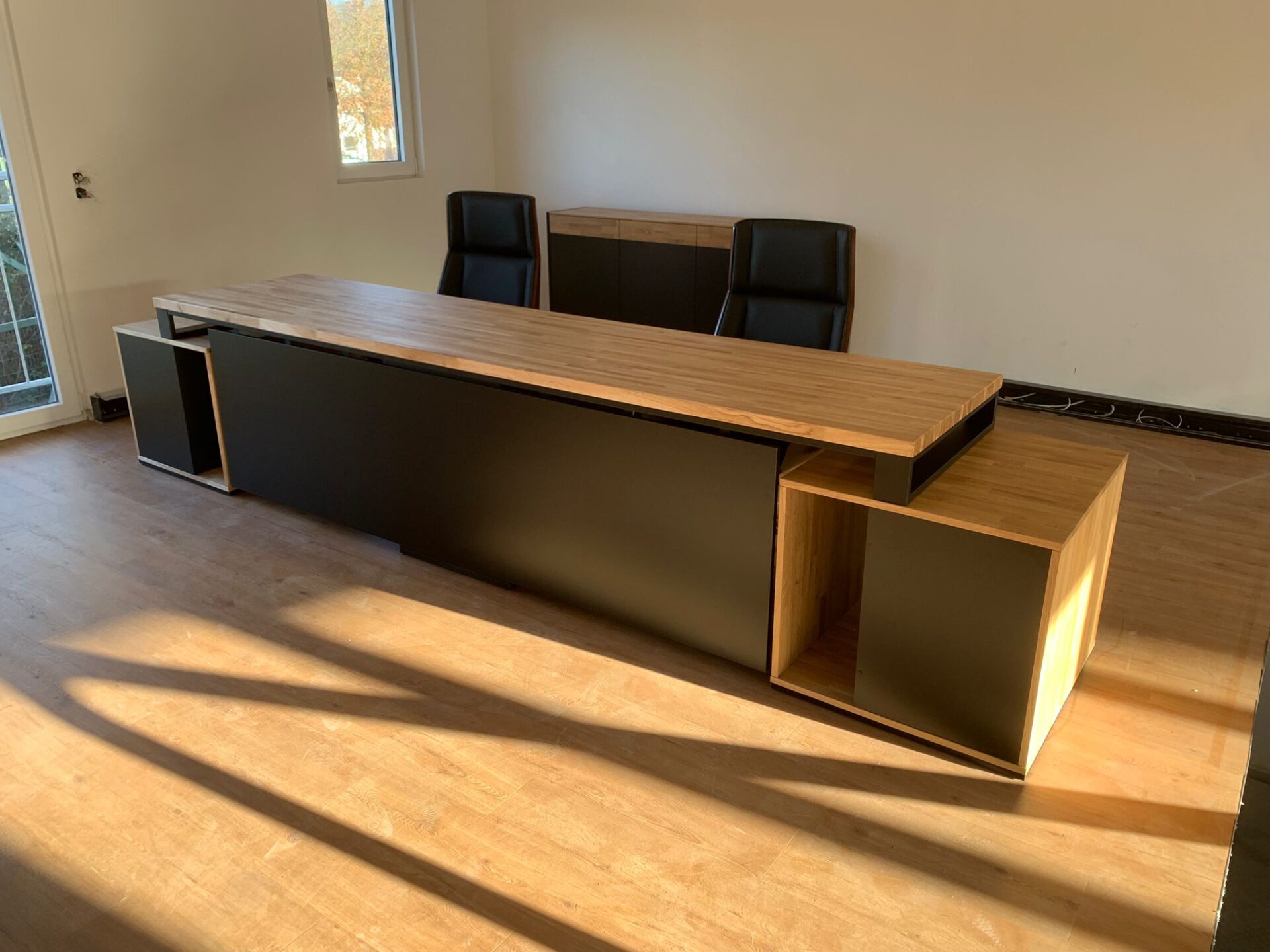 Schreibtisch für zwei Personen mit langer Holzplatte