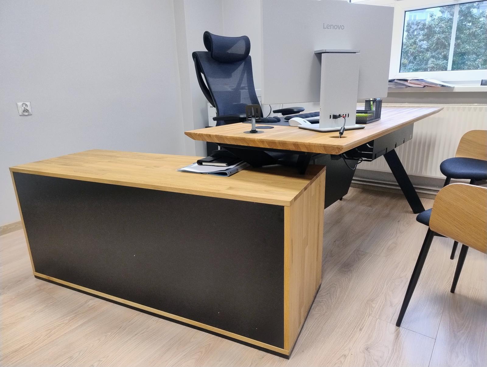 - Funktionalität – Diese Anforderung wurde mit einem vielseitigen Sockel erfüllt, dessen Möglichkeiten nicht nur bei den Schubladen enden. Der Sockel ist zusätzlich mit Platz für einen Desktop-Computer oder eine Tasche ausgestattet. Außerdem können Sie zwischen dem Sockel und der Tischplatte z. B. ein Notebook unterbringen.