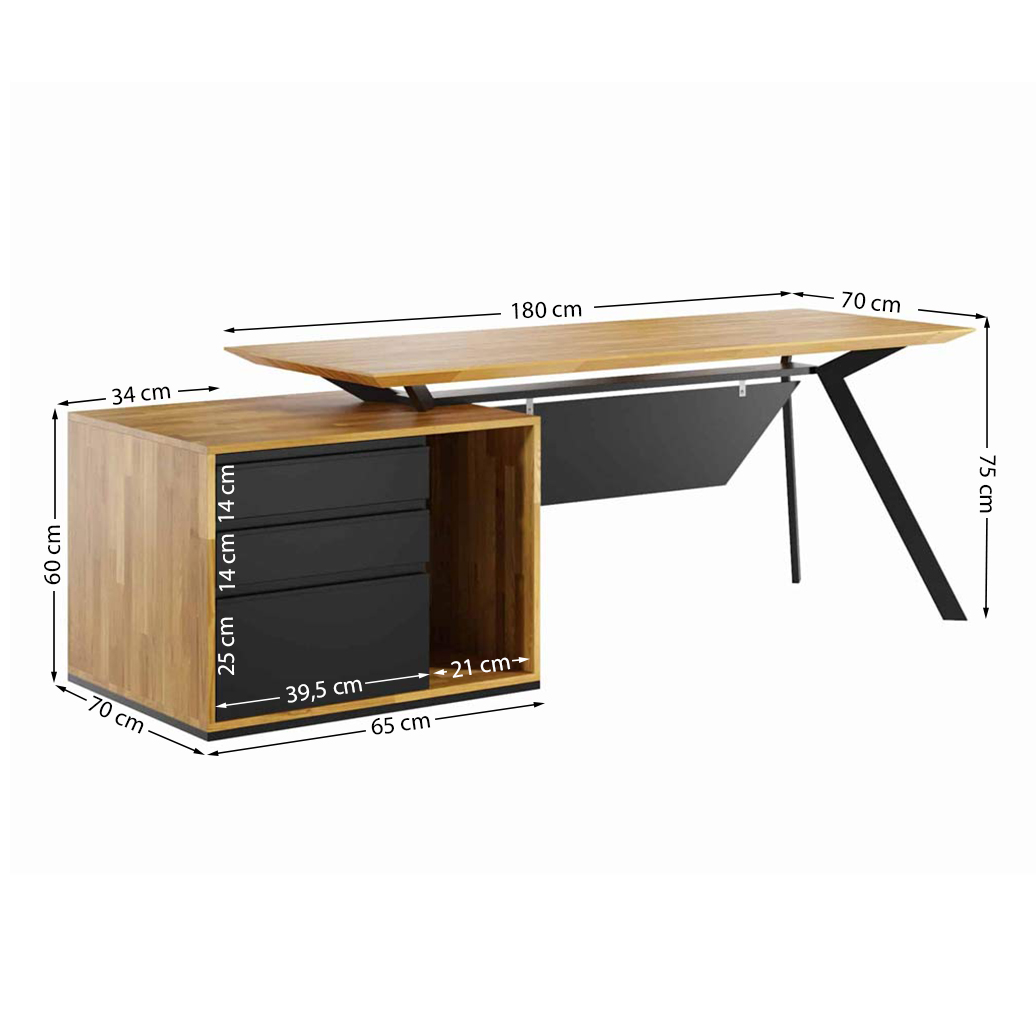 Die Gesamtlänge des Schreibtisches mit dem Sockel 180×70 cm beträgt ca. 214 cm.