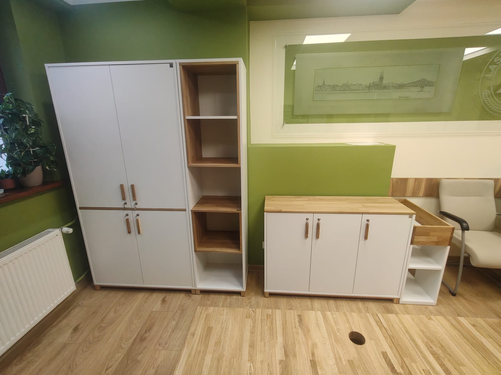 Die zweitürige Lösung ermöglicht den einfachen Zugriff auf Dokumente, Bürozubehör oder andere wichtige Dinge. Geräumige Einlegeböden sorgen für Ordnung und Übersichtlichkeit. Die Türfronten sind mit minimalistischen Griffen verziert, die einen subtilen Designakzent setzen.