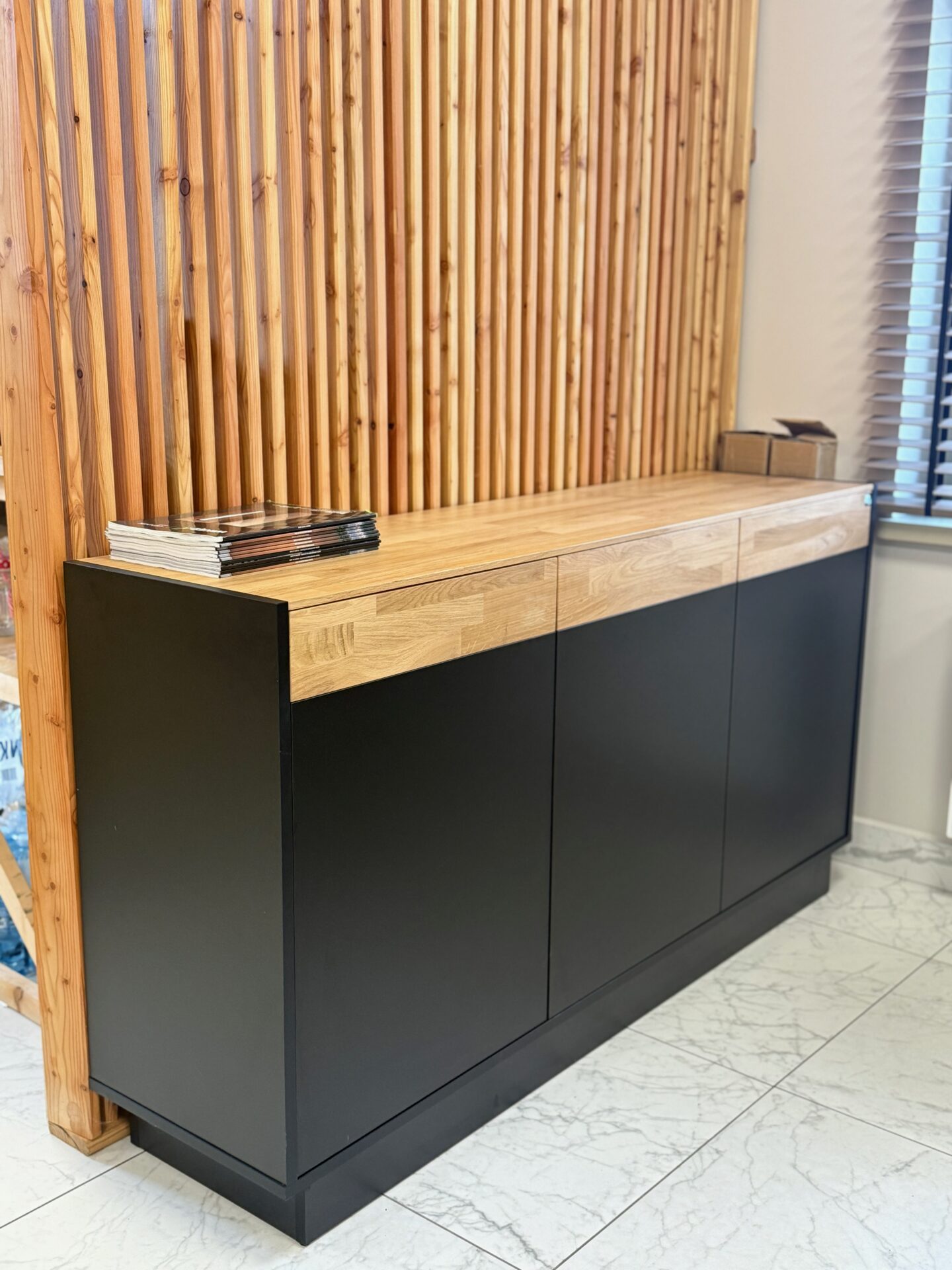 Die Kommode der Prestige Office Kollektion ist die ideale Wahl für Fans minimalistischer Ästhetik und Funktionalität. Durch ihre schlichte Form fügt sie sich perfekt in moderne Interieurs ein. Die dezente Zierleiste aus Eiche und die massive Holzplatte verleihen ihr einen einzigartigen Charakter. Der sich verjüngende Sockel der Kommode verleiht ihr Leichtigkeit, so dass das Möbelstück über dem Boden zu schweben scheint, was den Raum optisch vergrößert. Die Kommode in Schwarz strahlt Eleganz aus und fügt sich harmonisch in eine Vielzahl von Büro- und Wohnungseinrichtungen ein. Ideal für die Aufbewahrung von Dokumenten, Bürozubehör oder persönlichen Gegenständen.