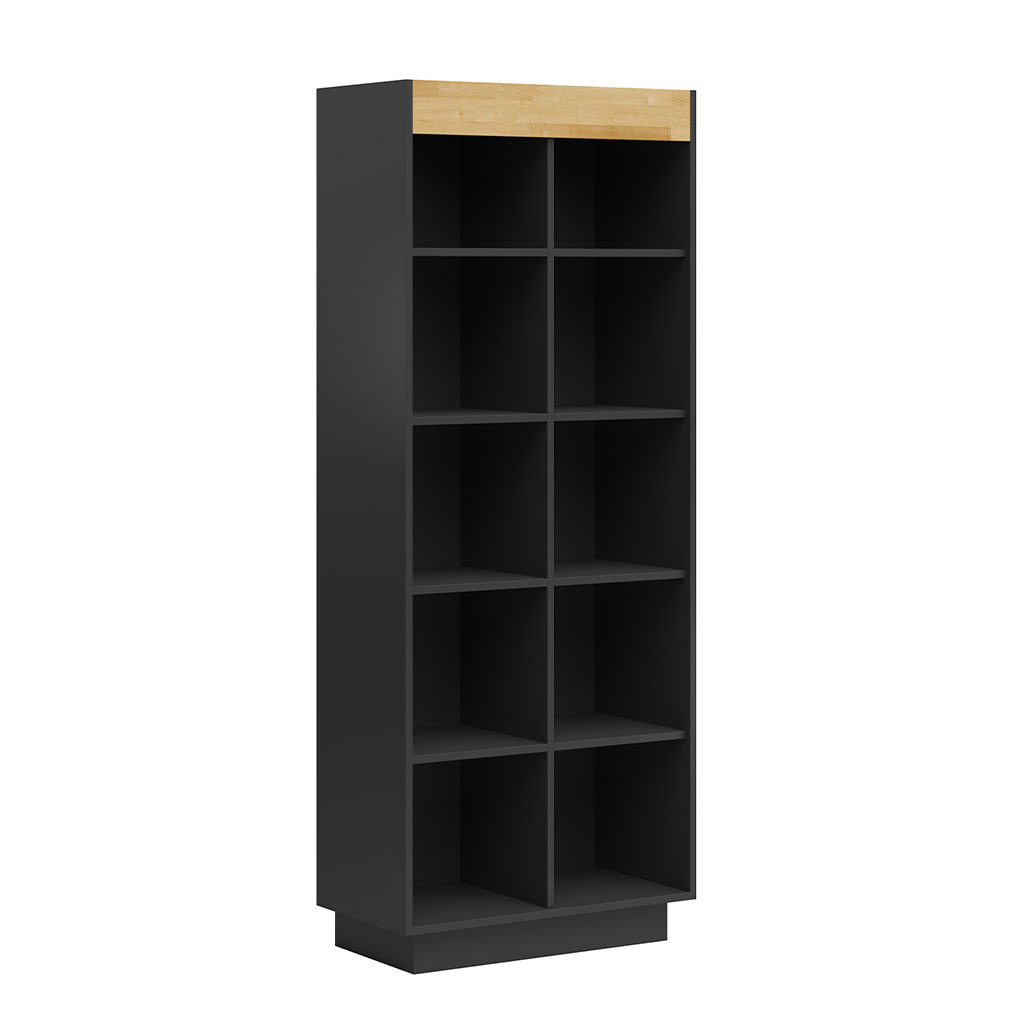 Modernes schwarzes Bücherregal mit Holzelementen für Bücher und Dekorationen