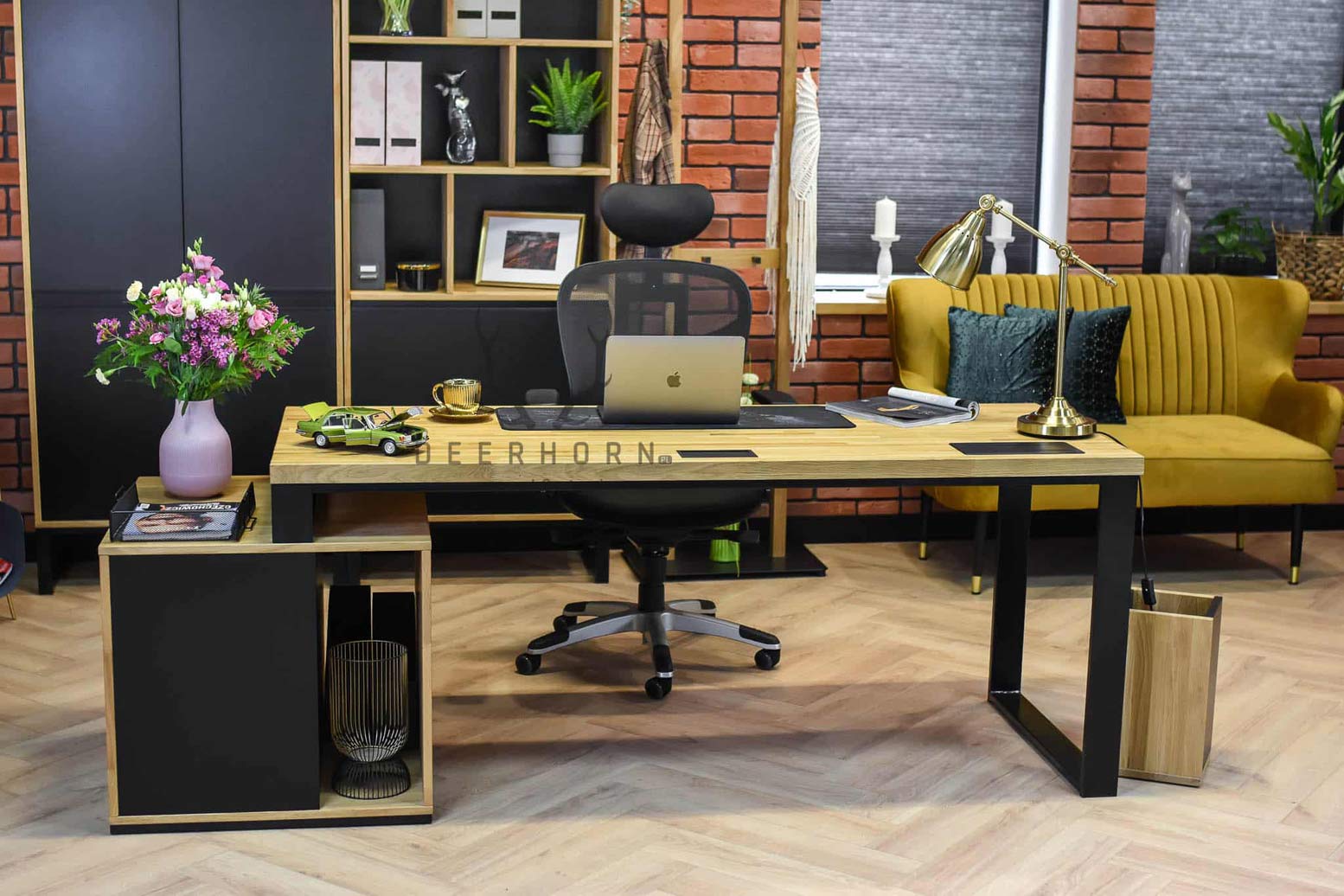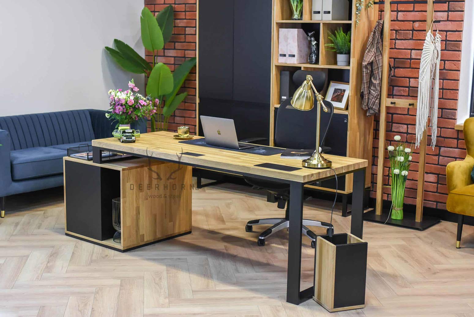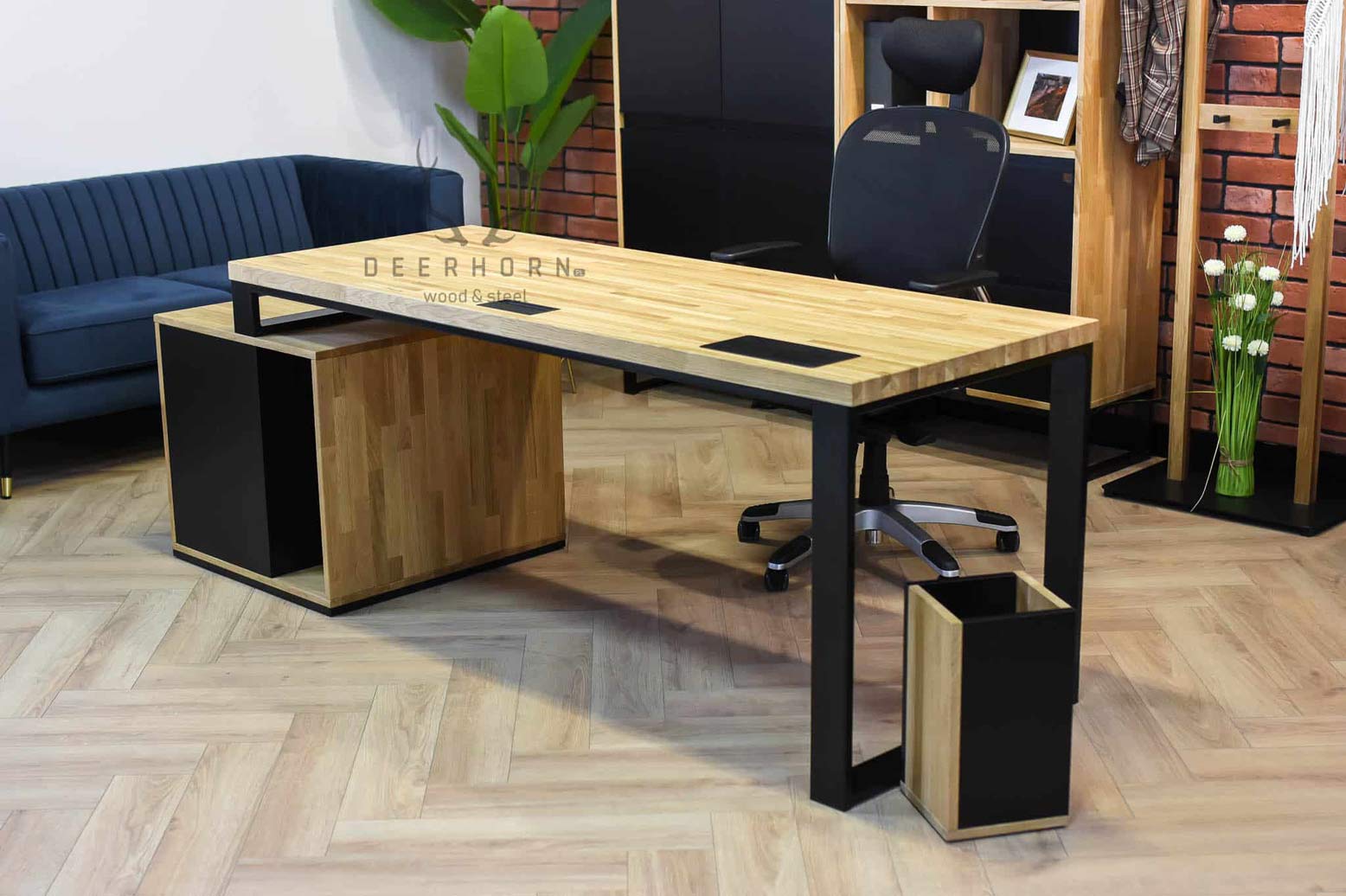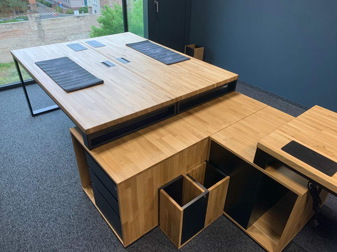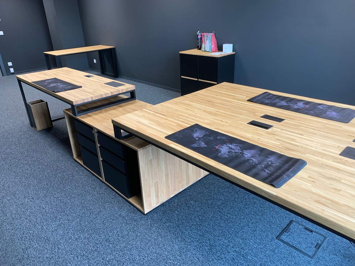 Die Kunden sind ständig auf der Suche nach modernen Lösungen, und deshalb sind wir auch bestrebt, unser Angebot weiterzuentwickeln. Auch der Metall-Holz-Schreibtisch wurde zu diesem Zweck umgestaltet. Es genügte, einen Teil des Rahmens durch eine kürzere Version zu ersetzen, um sein Aussehen zu erneuern. Der Metallrahmen in Kombination mit dem Sockel, der ebenfalls in einer aufgefrischten Version erhältlich ist, bildet ein kohärentes Ganzes und sieht dabei phänomenal aus. Dadurch nimmt er auch weniger Platz ein, was für kleinere Räume von Vorteil ist.