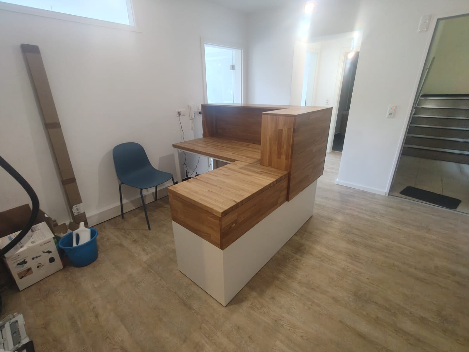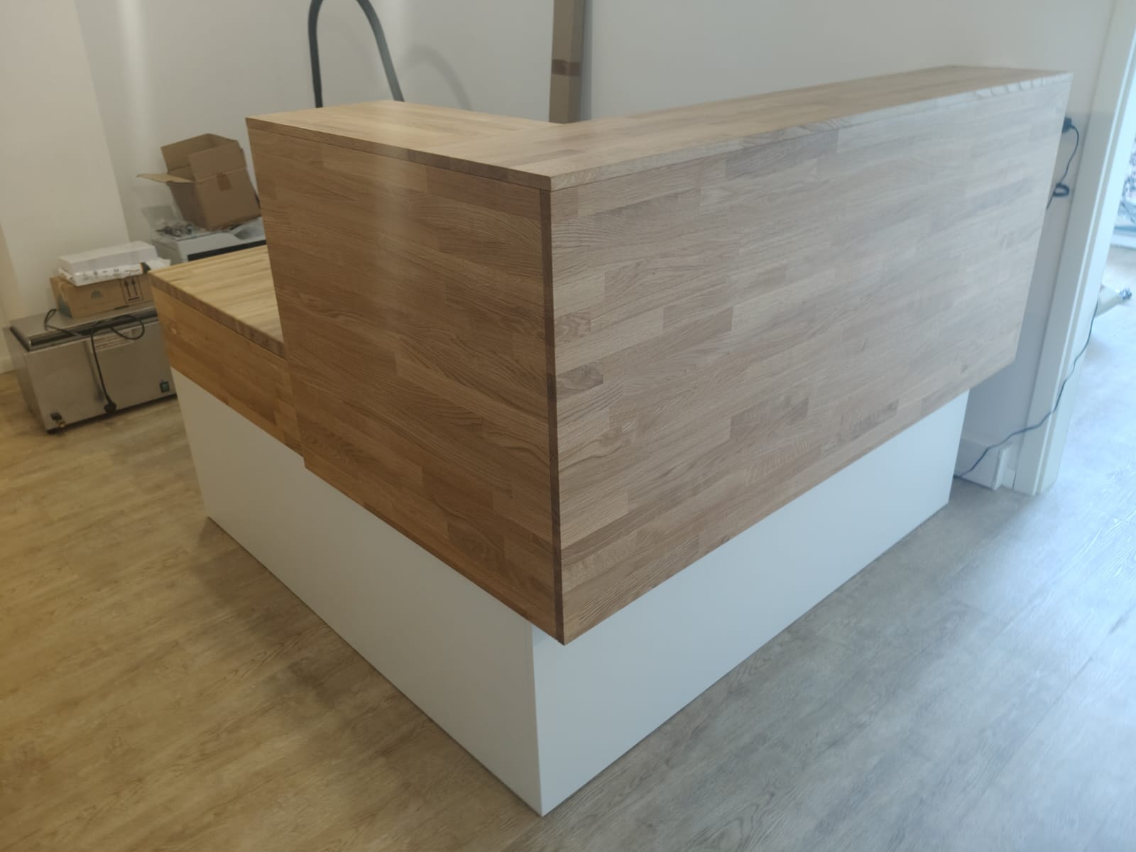 Der Empfangstresen wirkt sehr elegant, die Verarbeitung ist solide, das Holz sieht toll aus und verleiht dem Raum eine warme Atmosphäre; das Ganze ist funktional, komfortabel im Arbeitsalltag und hinterlässt bei den Kunden einen sehr guten ersten Eindruck.