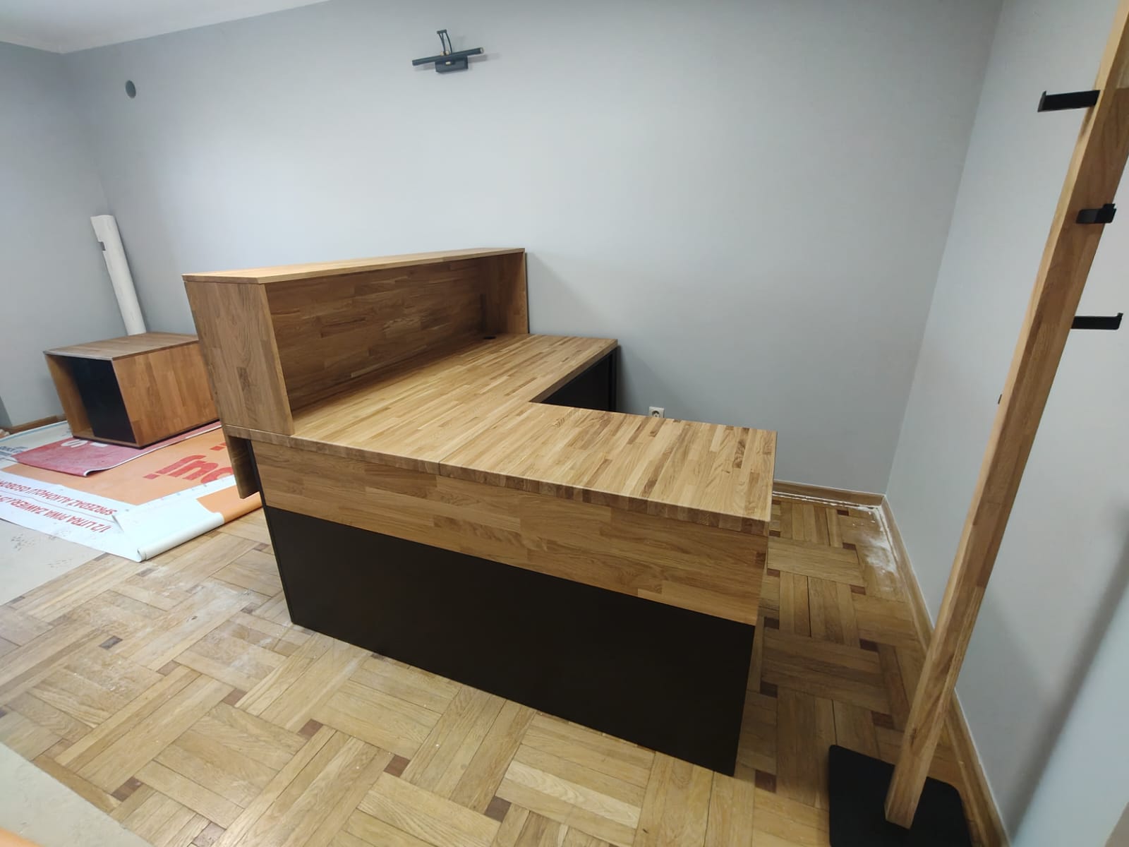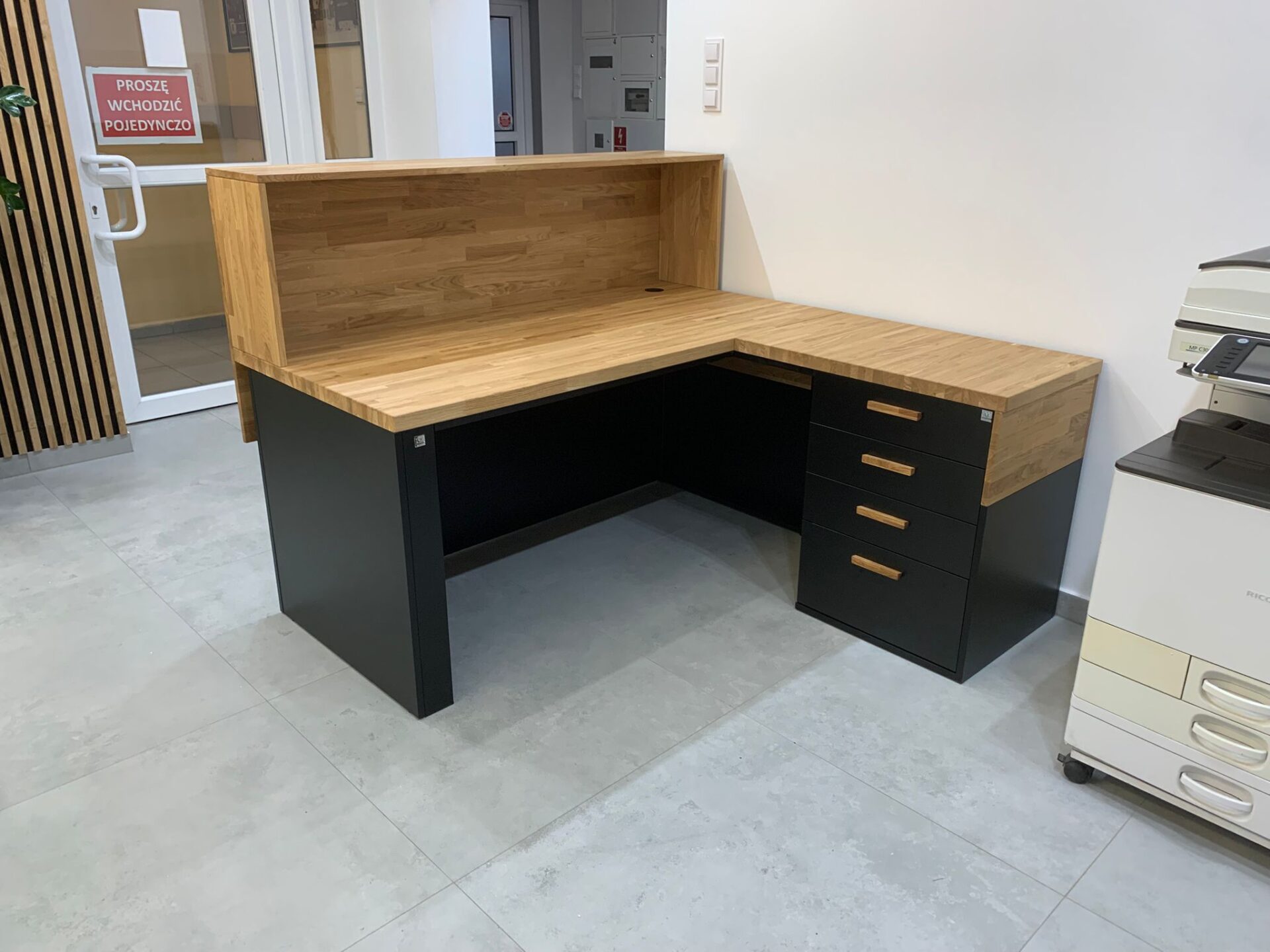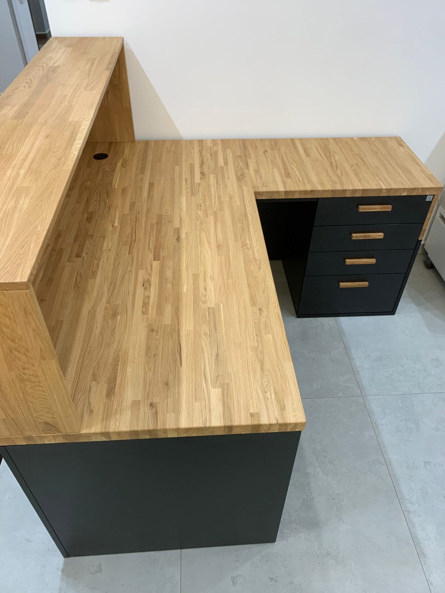 Die Rezeption sieht sehr elegant aus und macht einen tollen ersten Eindruck auf die Kunden. Die Eichenholzplatte sorgt für Wärme, während die schwarzen Elemente einen modernen Charakter verleihen. Die Arbeit daran ist bequem, alles ist griffbereit und es ist leicht, Ordnung zu halten. Eine sehr ästhetische und praktische Lösung – ich bin wirklich zufrieden.