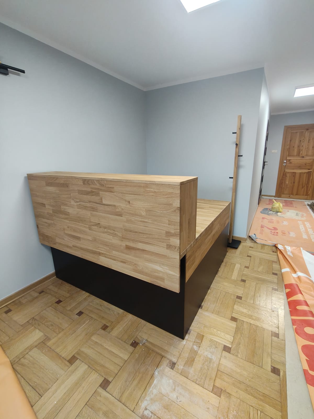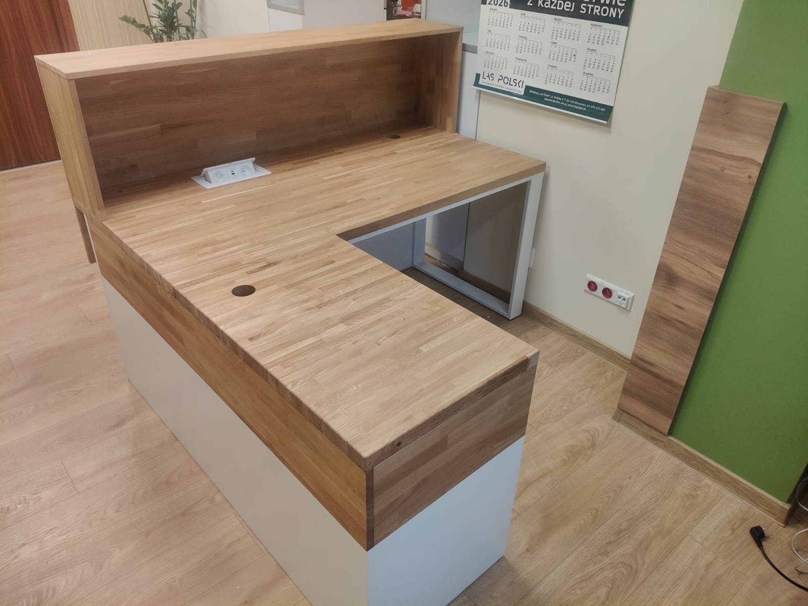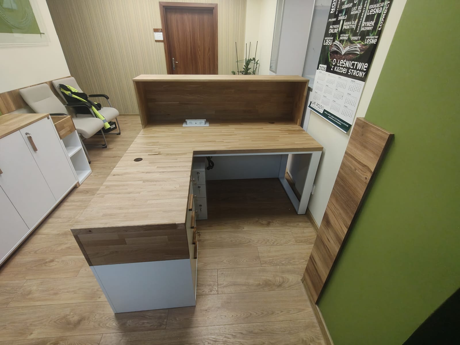 Die Rezeption sieht sehr elegant aus und macht einen tollen ersten Eindruck auf die Kunden. Die Eichenholzplatte sorgt für Wärme, während die schwarzen Elemente einen modernen Charakter verleihen. Die Arbeit daran ist bequem, alles ist griffbereit und es ist leicht, Ordnung zu halten. Eine sehr ästhetische und praktische Lösung – ich bin wirklich zufrieden.