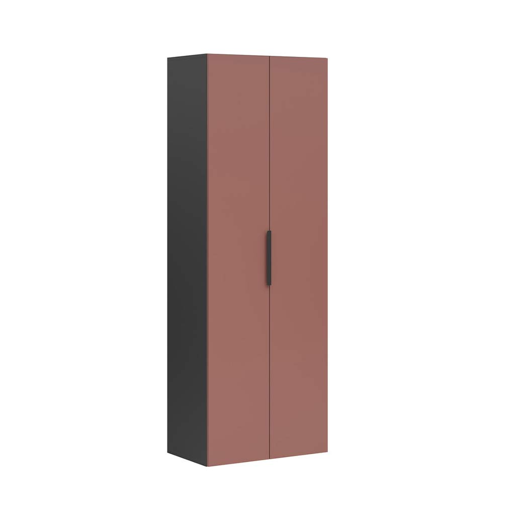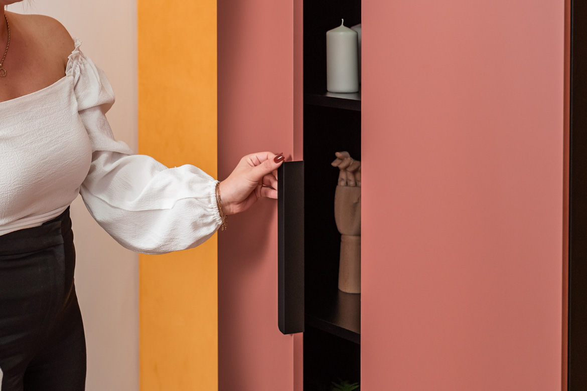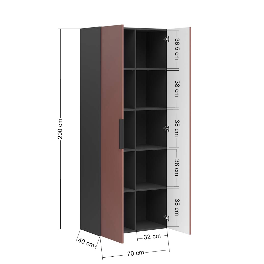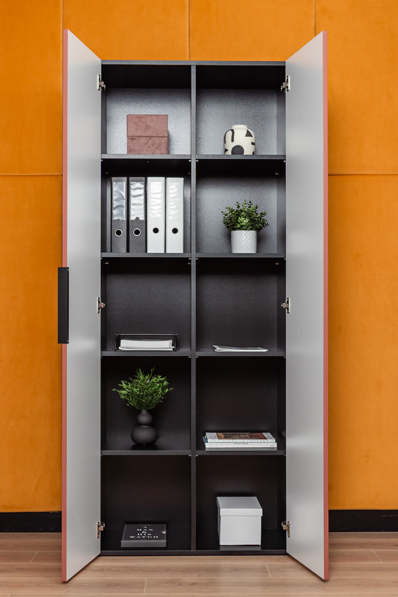 Stellen Sie sich ein Möbelstück vor, mit dem Sie Ordnung halten können und das sich gleichzeitig mit Eleganz und Leichtigkeit in Ihren Büroraum einfügt. Ein Schrank mit massiven Fronten, hinter denen sich bis zu zehn geräumige Einlegeböden befinden – ideal für Dokumente, Bürozubehör und all die Dinge, die Sie nicht im Blick haben müssen, aber dennoch griffbereit haben möchten. Hinzu kommt ein dezenter Aluminiumgriff, der den minimalistischen Look des Möbels unterstreicht. Die Kombination von mattem Schwarz mit Fronten in einem Ziegelton verleiht den Möbeln einen modernen und zurückhaltenden Ausdruck. Es ist ein Farbschema, das perfekt mit dem Grün der Pflanzen und dem natürlichen Licht des Büros harmoniert.
