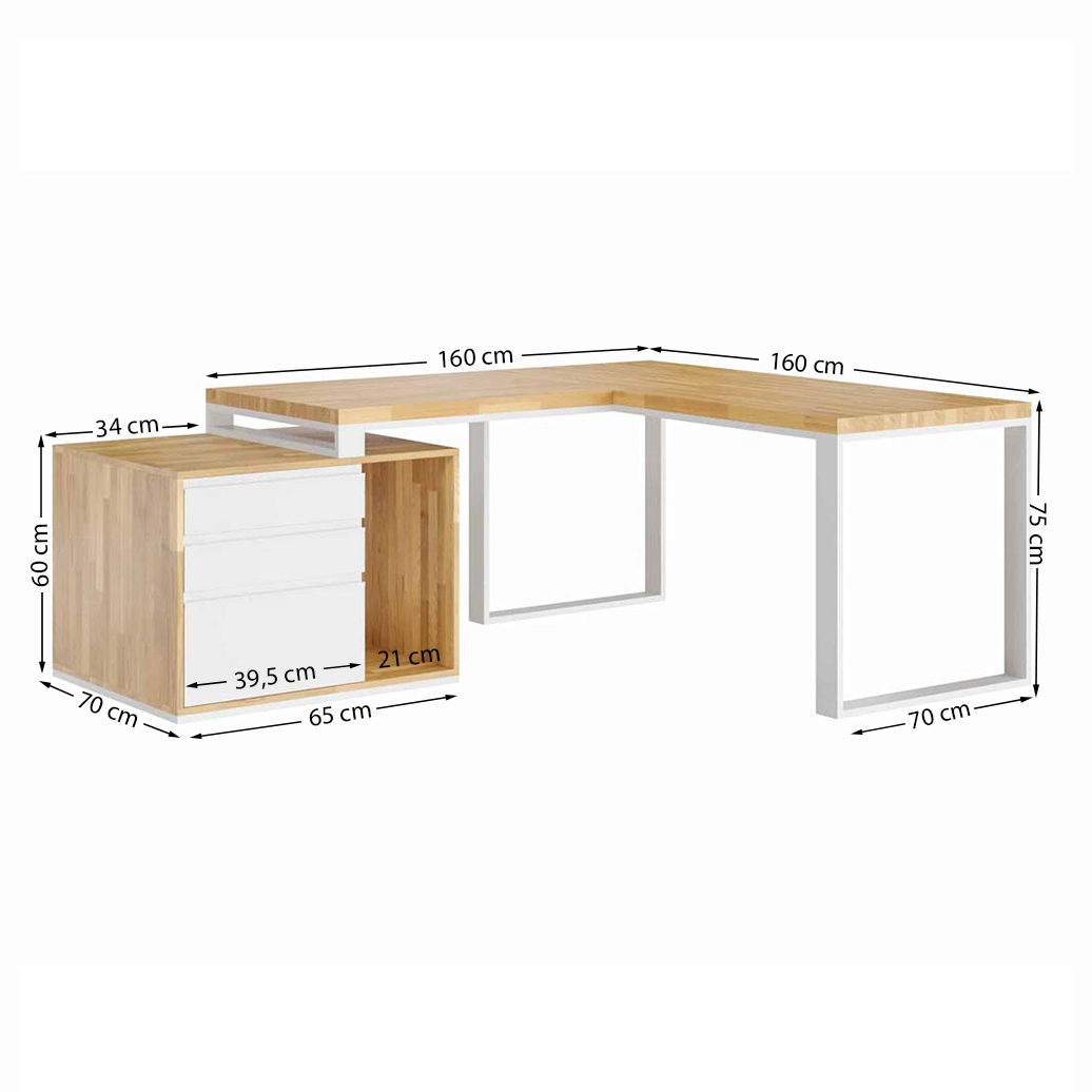 Der weiße Eckschreibtisch ist eine Kombination aus natürlichem Eichenholz und einem stabilen Gestell. Durch diese Kombination entstand nicht nur ein ungewöhnliches Design, sondern auch ein langlebiges, ökologisches und komfortables Möbelstück für die tägliche Arbeit.
