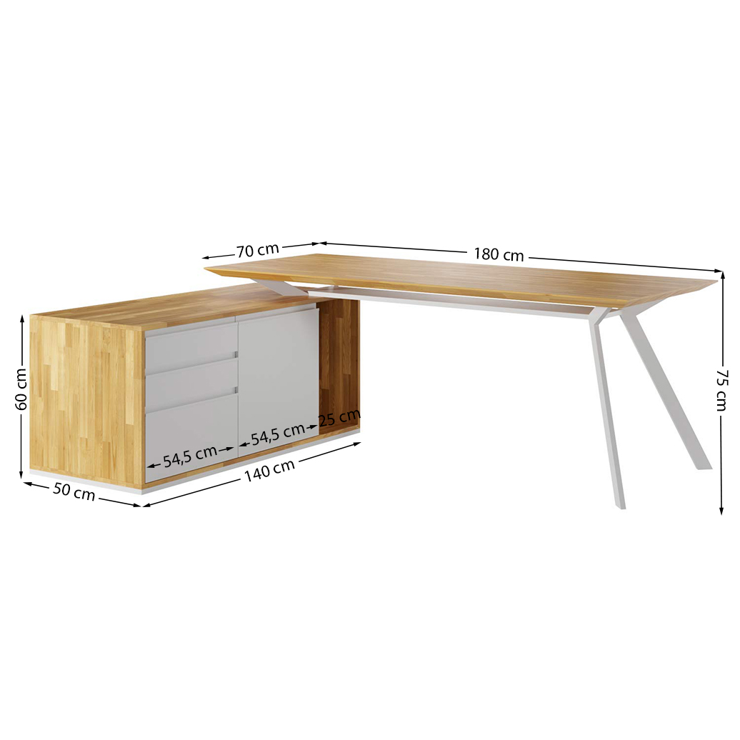 Der Schreibtisch mit Holzplatte und Metall zeichnet sich durch die ungewöhnliche Form des Gestells aus. Es wurde auch ein 45°-Unterschnitt der Oberseite verwendet, der einen phänomenalen Effekt hat. Um das Öffnen zu erleichtern, haben der Büroschrank mit Fachböden für Akten, das Büro-Bücherregal mit Fachböden sowie die Kommode für Büro und Haushalt Fronten mit einem Hinterschnitt, den wir – insbesondere – den Bedürfnissen von Frauen angepasst haben. Jede dieser Änderungen macht das einzelne Produkt einzigartig, was ein großer Vorteil für unser Unternehmen ist.