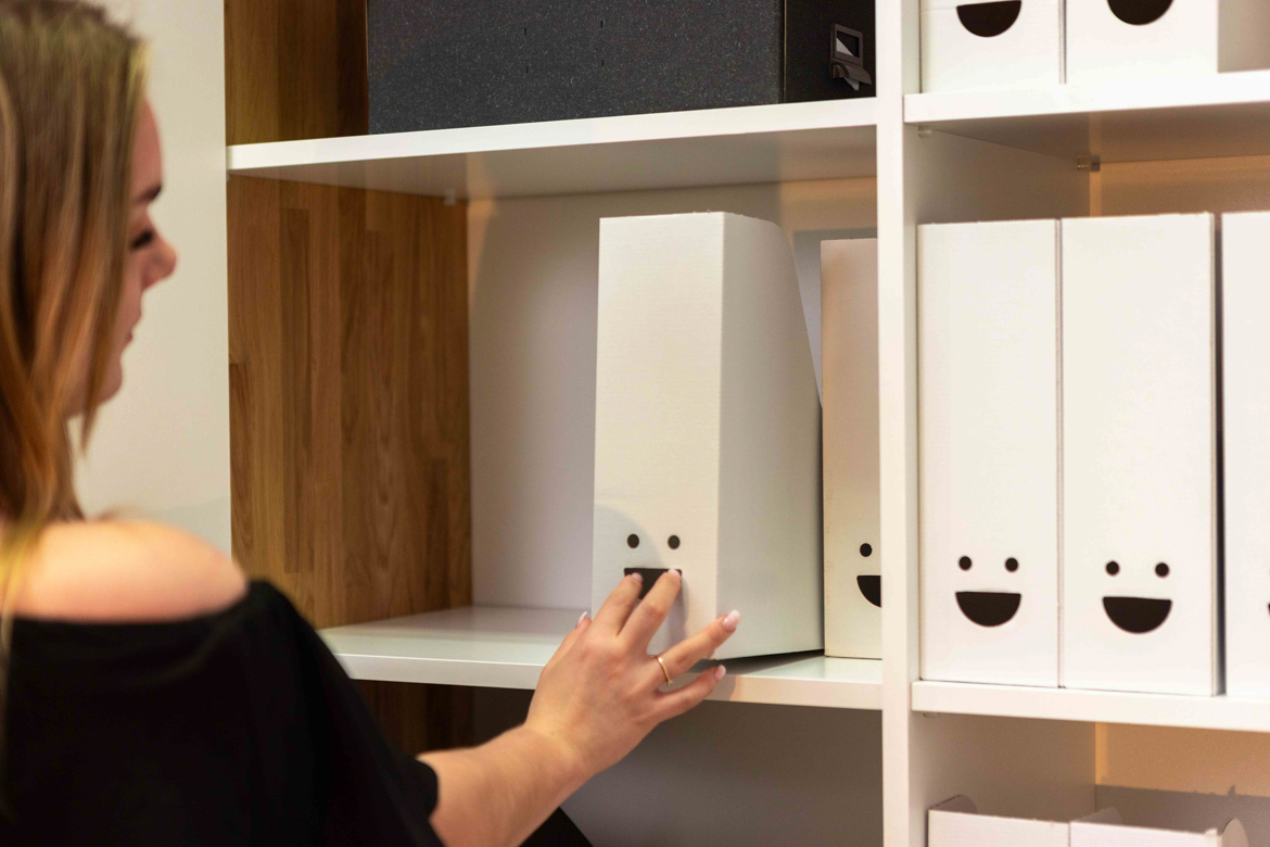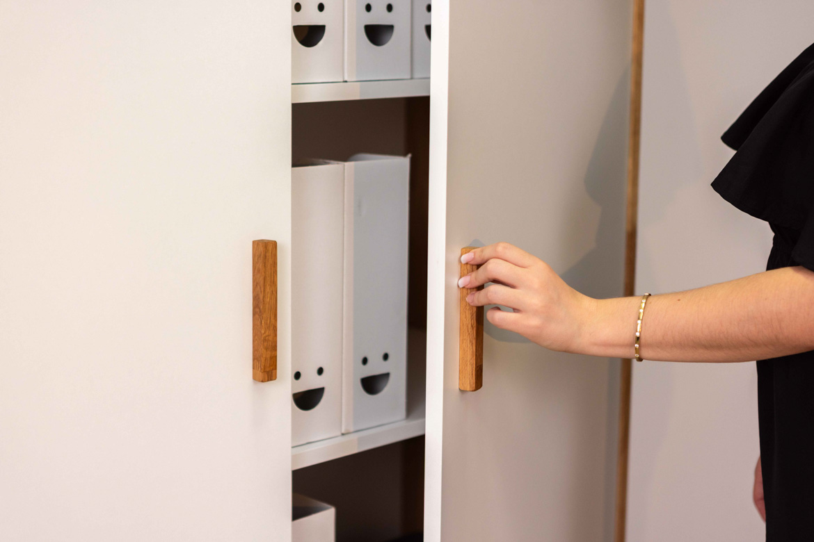 Wie versenden wir die Schränke? 90% unserer Aktenschränke werden komplett und ohne Verschraubung vor Ort ausgeliefert. Das hohe Gewicht macht es ein wenig schwierig, es nach Hause oder ins Büro zu bringen. In diesem Fall empfehlen wir, die Regale herauszuziehen. Dadurch wird das Gewicht reduziert. Wenn das Anheben immer noch schwierig ist, können die Vorderseiten abgenommen werden. Dafür brauchen Sie nicht einmal einen Schraubenzieher. Drücken Sie einfach die Knöpfe an den Scharnieren. Sobald die Einlegeböden und Fronten entfernt sind, ist das Gewicht sehr optimal.
