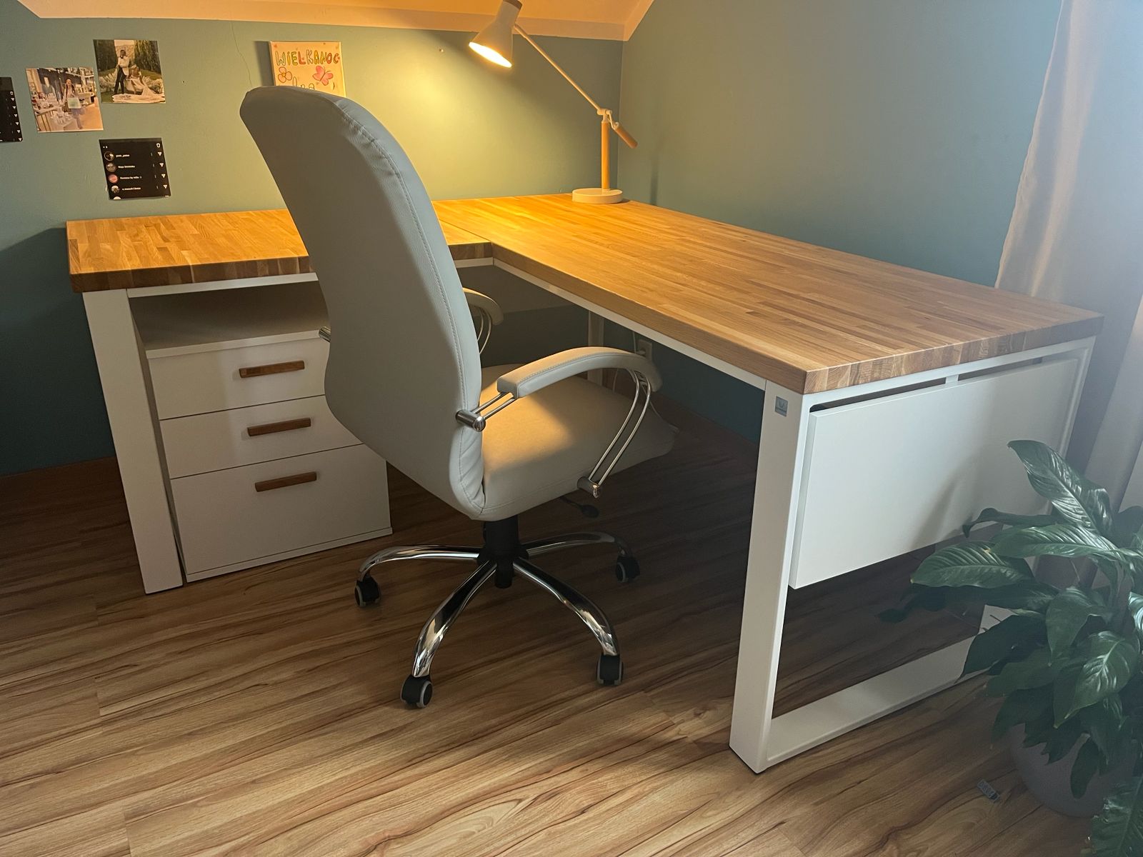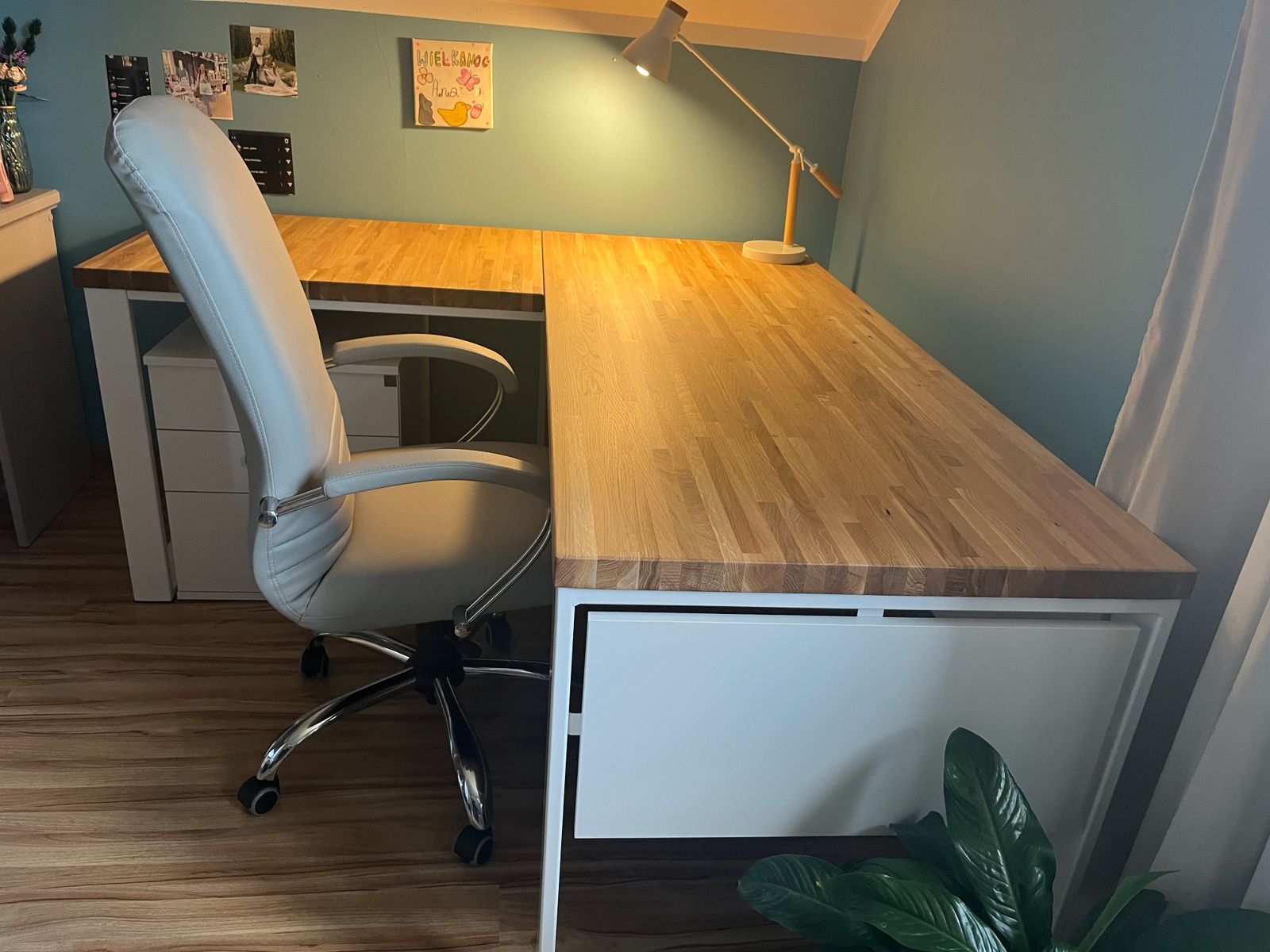 Ich wollte einen Schreibtisch, der schön ist, aber auch im Alltag bequem – und das war ein Volltreffer. Die Eichenholzplatte sieht sehr elegant aus und verleiht dem Raum Wärme, während die helle Form das Ganze optisch leicht macht. Man kann bequem daran arbeiten und alles hat seinen Platz. Ich bin wirklich sehr zufrieden.