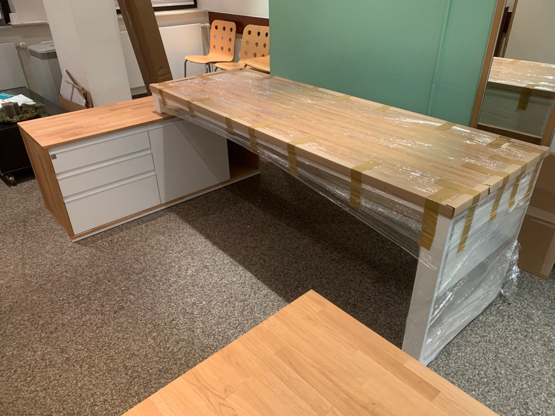 Alle Möbel werden auf Paletten zusammengebaut geliefert, mit Ausnahme von Eckschreibtischen und großen Konferenztischen, die vor Ort ein wenig montiert werden müssen.