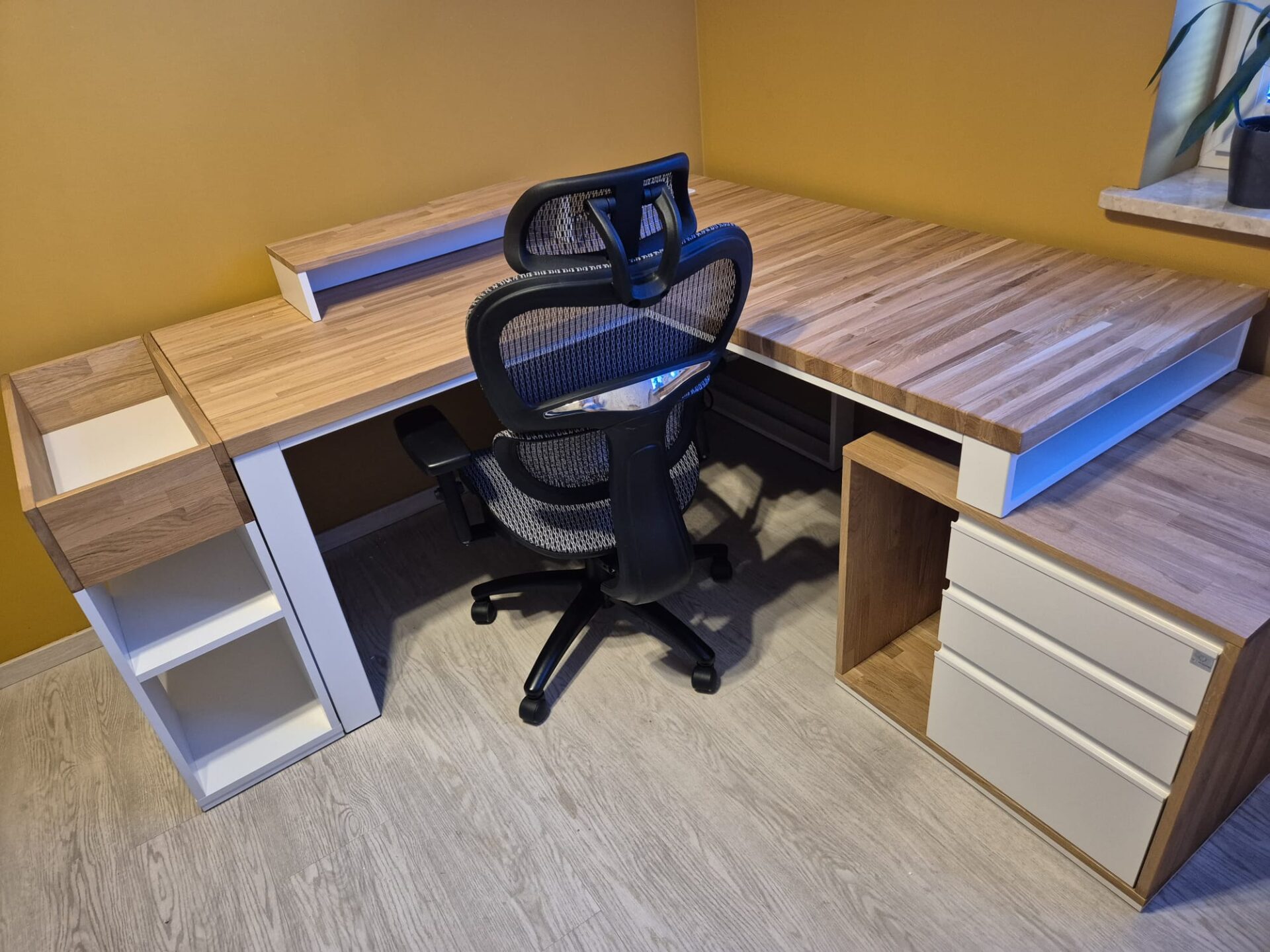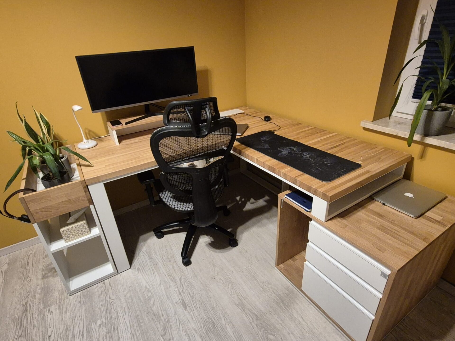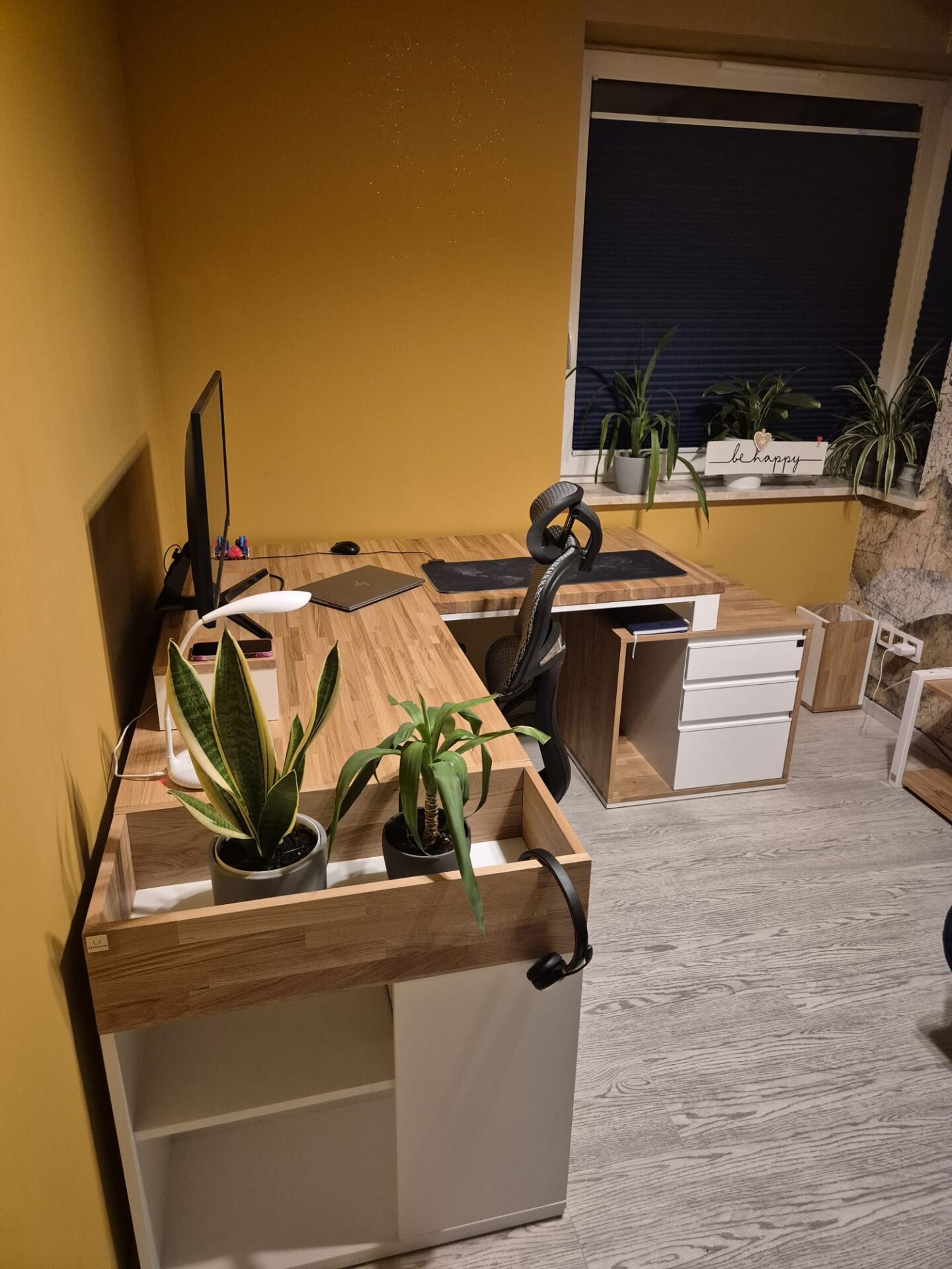 Eckbüro mit Container, alles griffbereit, kein Chaos und viel komfortabler Platz zum Arbeiten