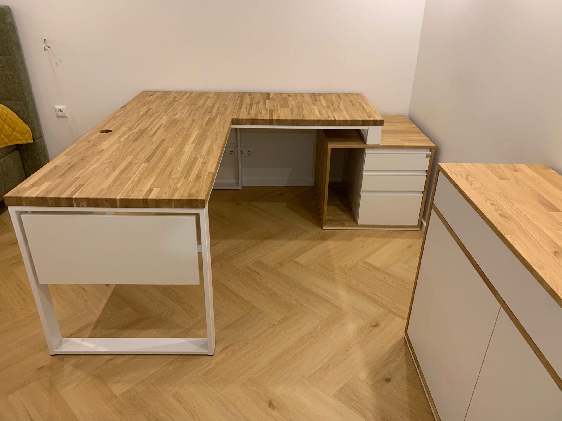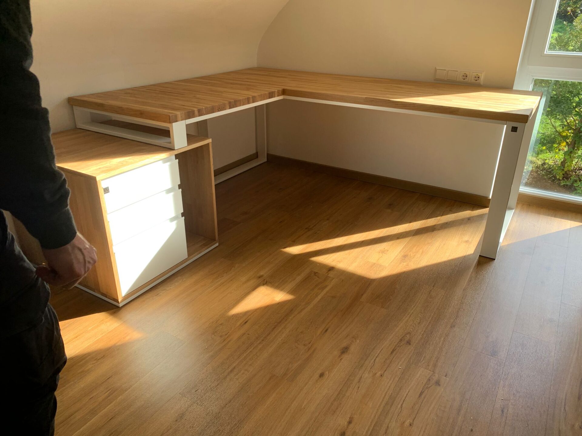 - Der Schreibtisch hat Abdeckplatten aus einer Möbelplatte in weiß matt. Wir können die Schwarzdecke aus 18 mm dickem Eichenholz herstellen.