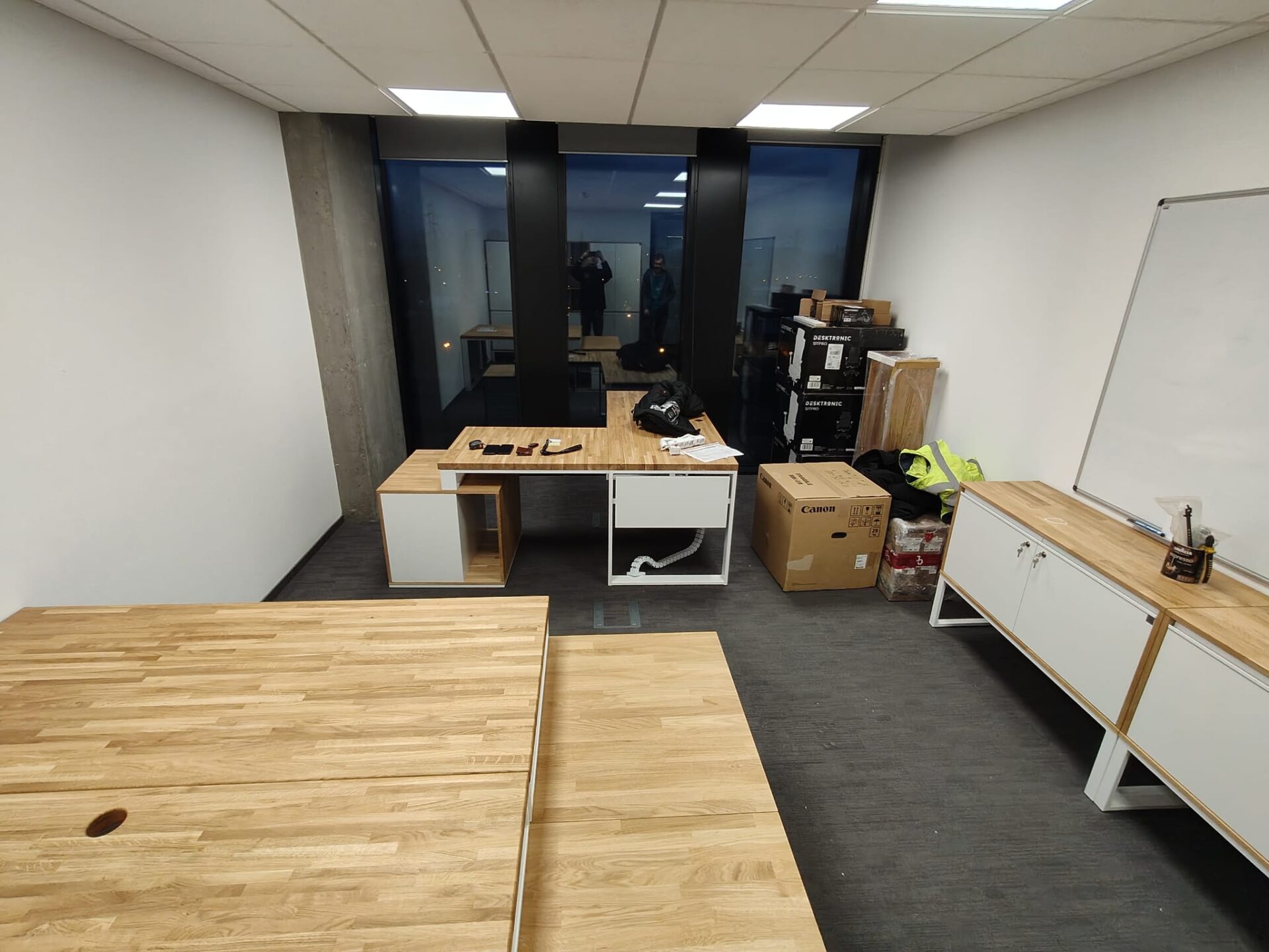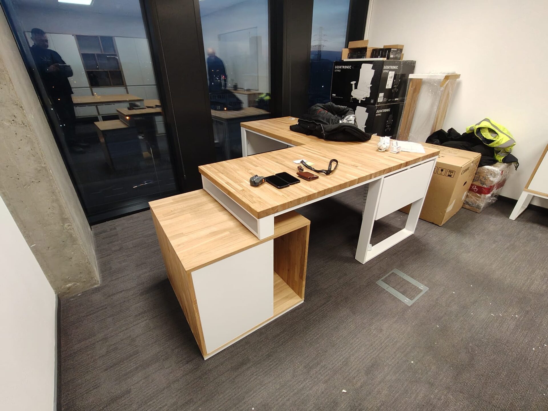 Alle Möbel werden auf Paletten zusammengebaut geliefert, mit Ausnahme von Eckschreibtischen und großen Konferenztischen, die vor Ort ein wenig montiert werden müssen.