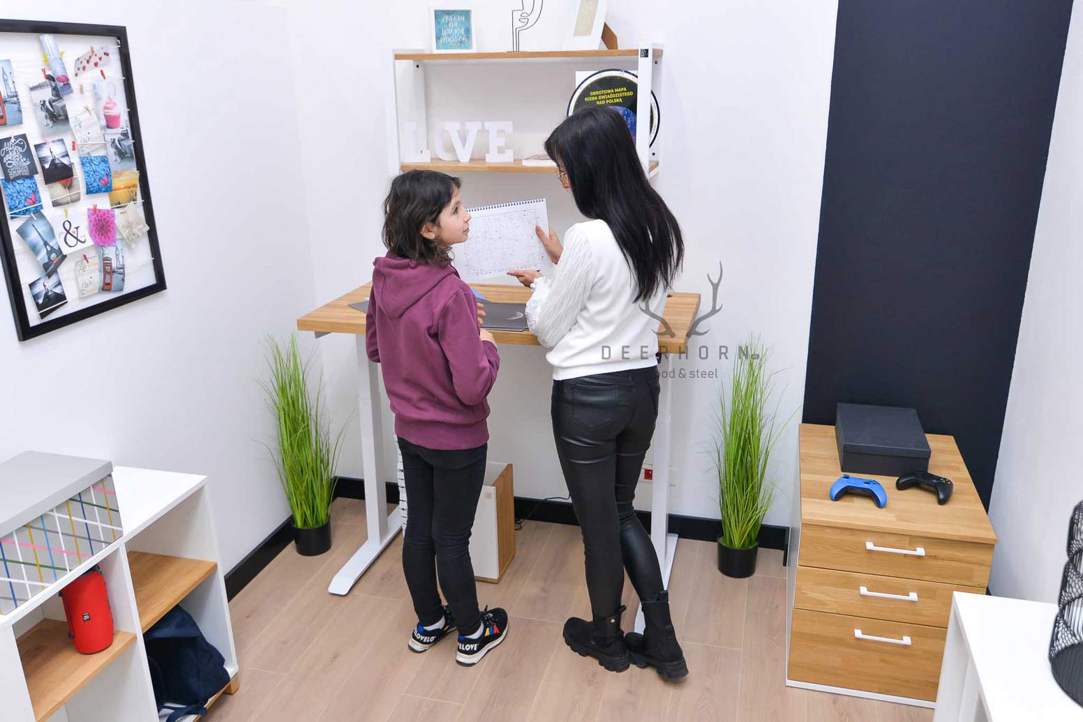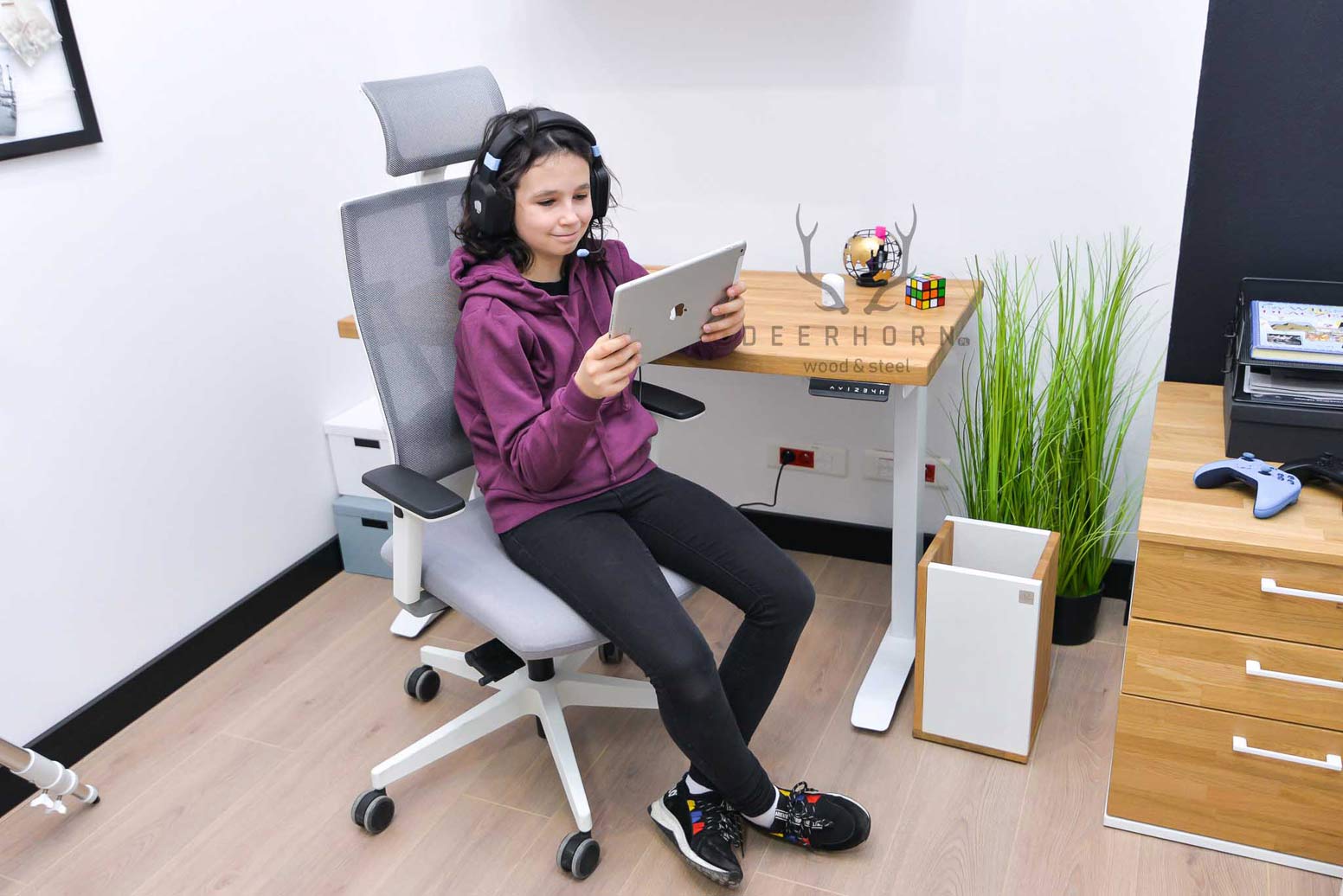 Ein solcher Schreibtisch wächst mit dem Kind mit, und es besteht jederzeit die Möglichkeit, die Höhe mit einer Memory-Einstellung anzupassen.