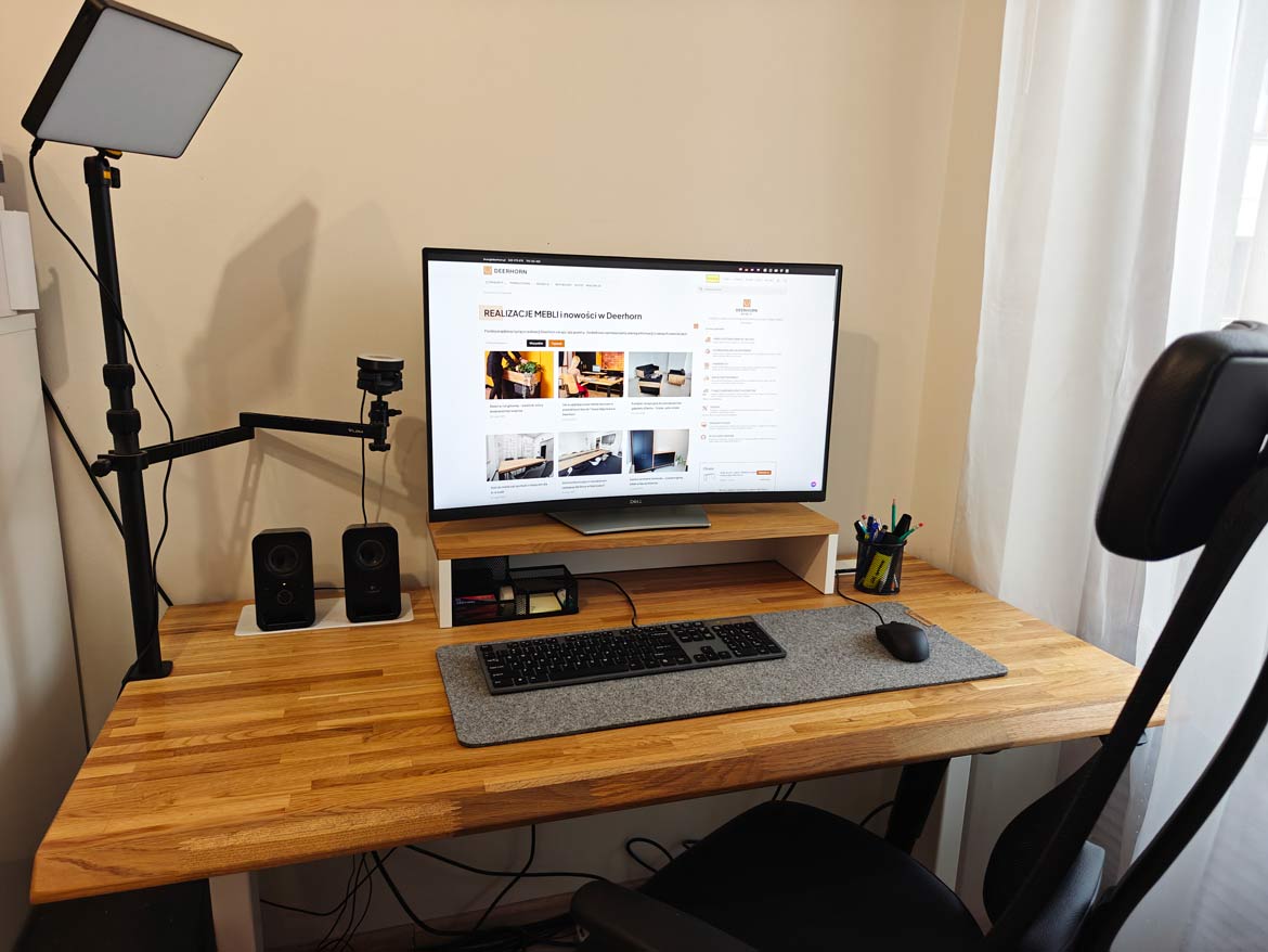 Darüber hinaus ist der Schreibtisch mit einer Monitorverlängerung ausgestattet, die den Arbeitskomfort verbessert und die Tischplatte aufgeräumt hält. Es ist ein praktischer und eleganter Schreibtisch, ideal für die Arbeit an entfernten Standorten oder im Home Office, wo Komfort und Ästhetik jeden Tag wichtig sind.