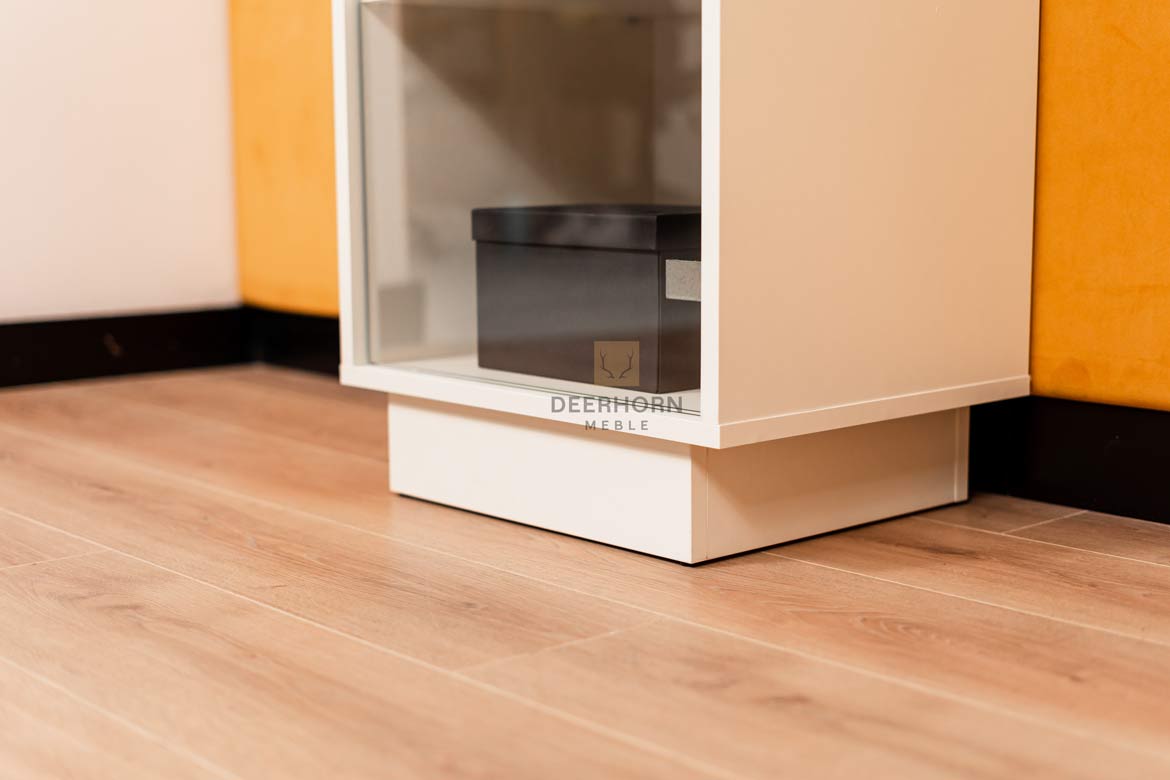 Die elegante, schmale Vitrine mit Glasfront ist die perfekte Lösung für kleinere Räume, in denen jeder Zentimeter zählt. Durch seine schlanke Form passt dieses Möbelstück perfekt in moderne, minimalistische Interieurs, und dank der praktischen Einlegeböden können Sie Ihre Lieblingsdekorationen, Bücher oder Ordner ausstellen. Die Kombination aus Weiß, Glas und Holz verleiht dem Ganzen einen leichten und modernen Charakter und macht das Regal nicht nur zu einem Möbelstück, sondern auch zu einem eleganten Element der Einrichtung.