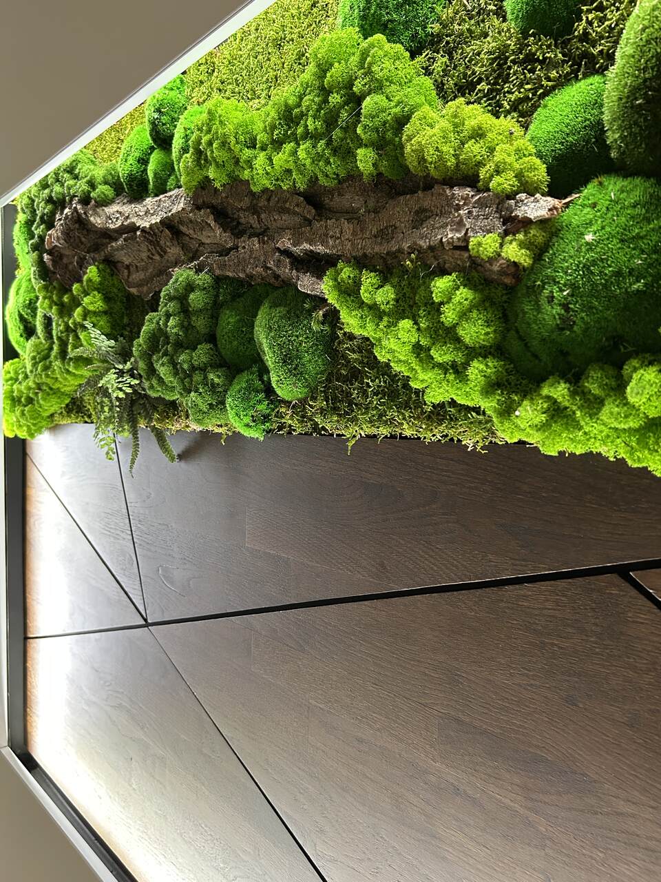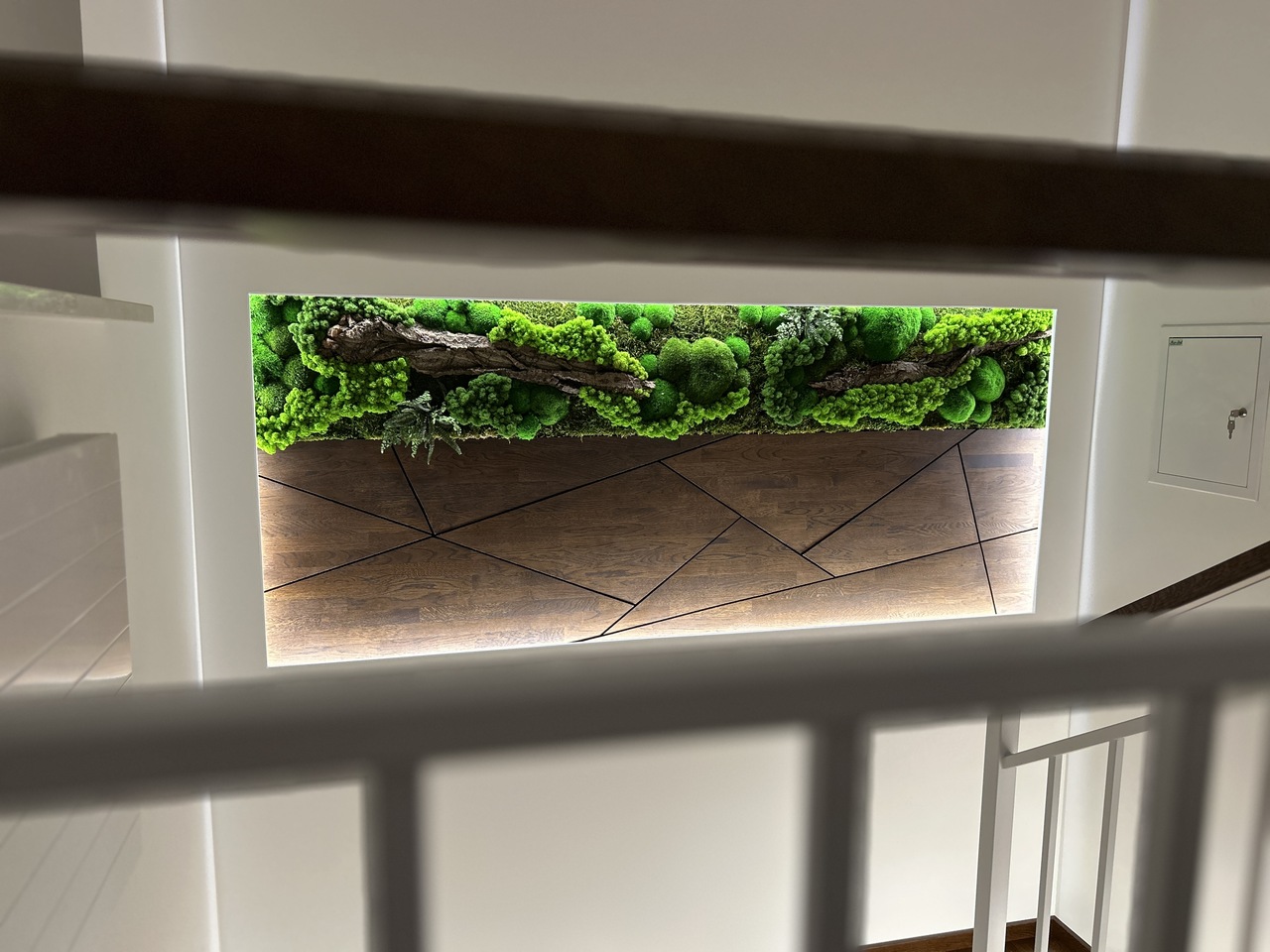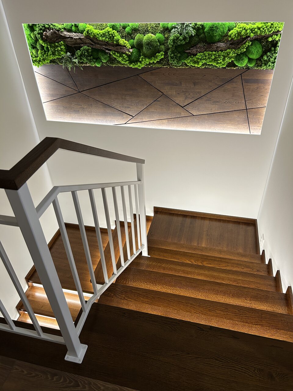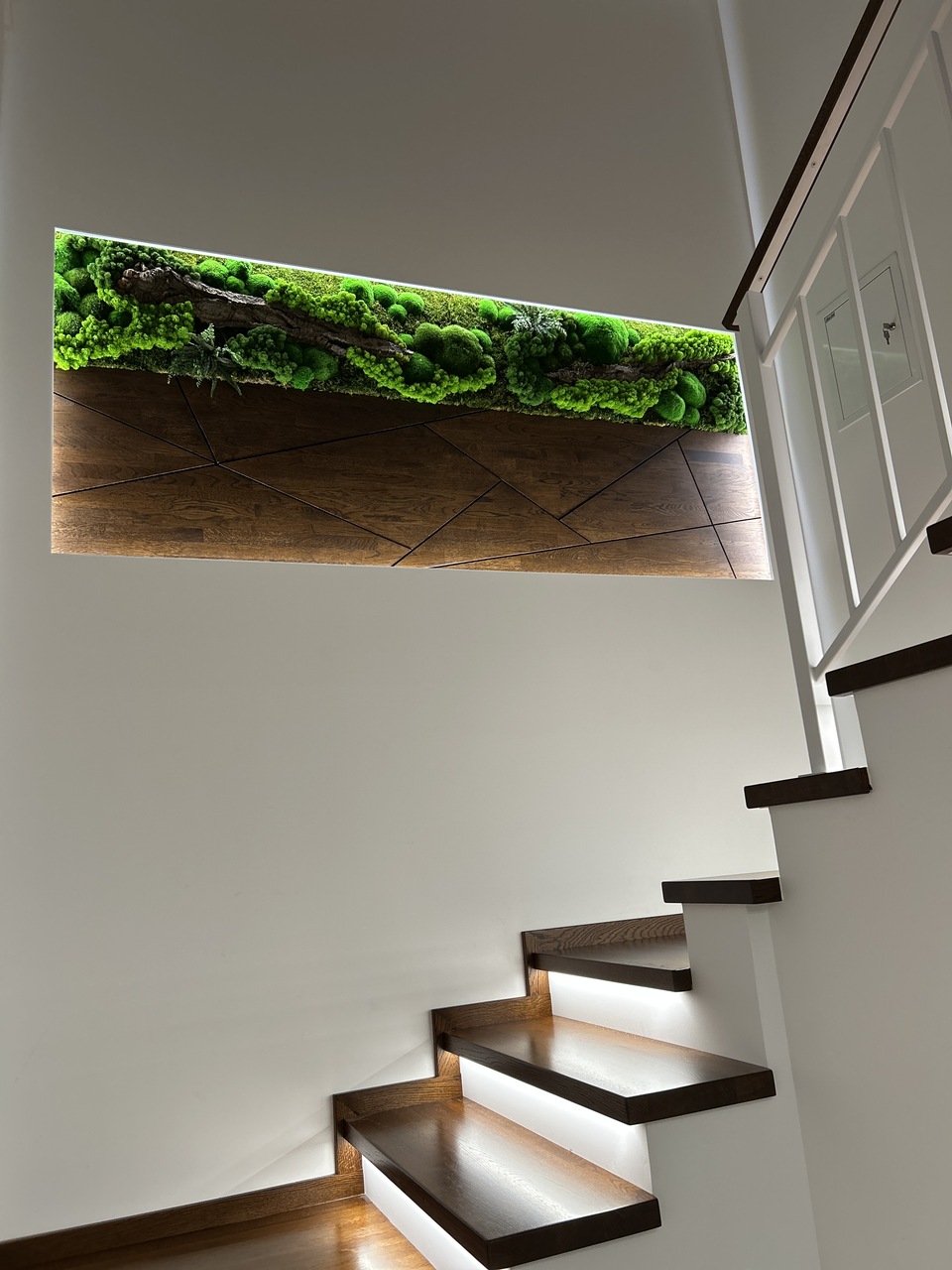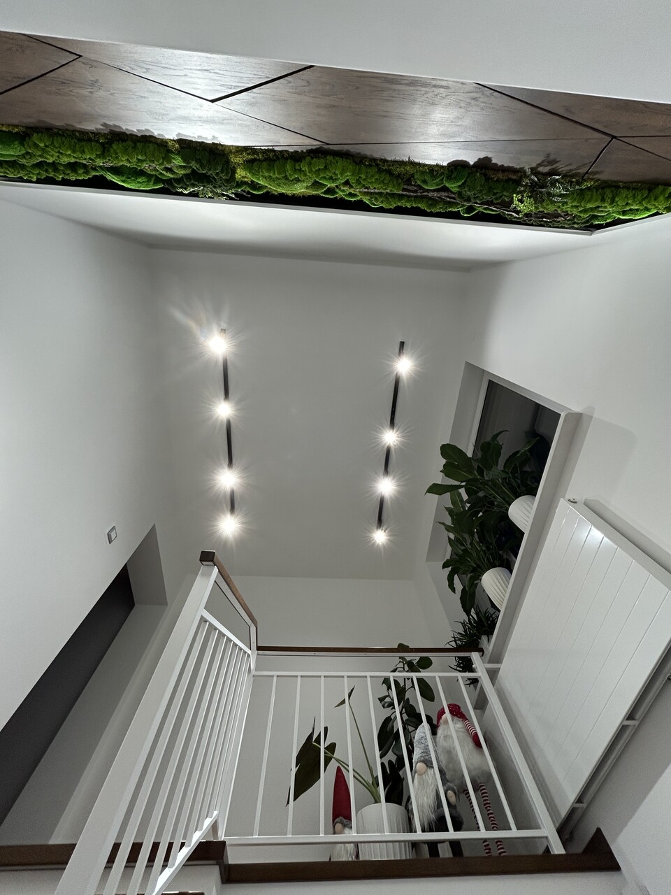 Hinzu kam Moos, ein lebendiger Akzent, der die Natürlichkeit in ihrer reinsten Form in den Innenraum brachte. Dank ihm war die Treppe nicht mehr nur ein kommunikativer Raum, sondern wurde zu einem Ort, den man wirklich fühlt. Es war die Kombination aus Holz und Grün, die uns das gab, wonach wir die ganze Zeit gesucht hatten – das Gefühl, der Natur in unserem eigenen Haus nahe zu sein.