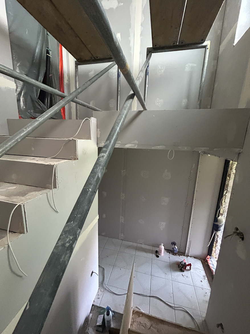 Und dann ging es ernsthaft los. Es war Zeit für eine Generalüberholung des Treppenhauses. Ein Team betrat das Haus und arbeitete vom ersten Tag an effizient und organisiert. Das Gerüst tauchte fast sofort auf und mit ihm mehrere Leute, die gleichzeitig auf verschiedenen Ebenen arbeiteten. Jeder Tag brachte sichtbare Veränderungen – Wände, Decken, Details begannen Schritt für Schritt einen neuen Charakter anzunehmen.